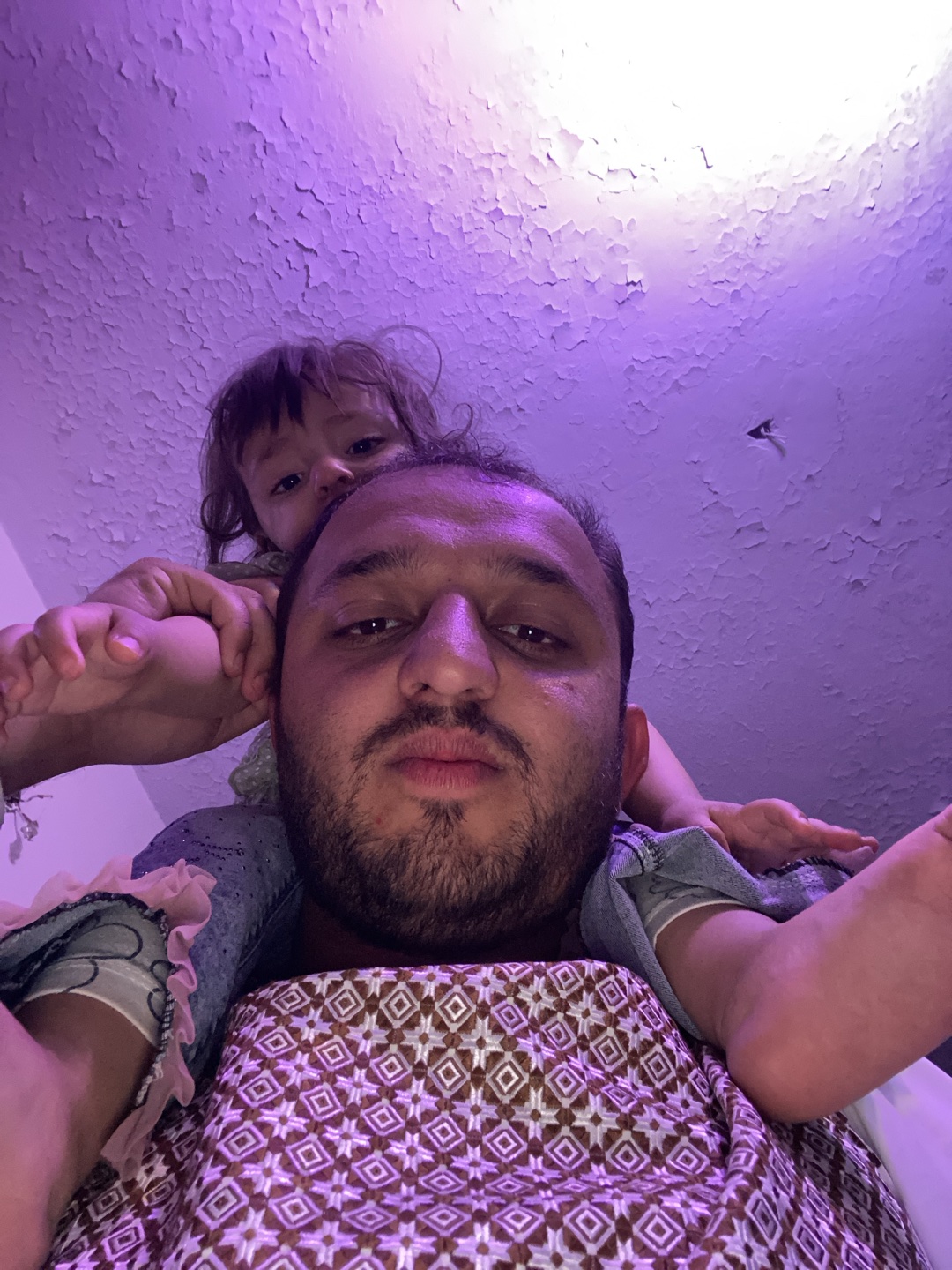 A close-up, low-angle selfie shows a man with a child. The man has dark hair and a beard, and is wearing a patterned shirt. The child is on the man's shoulders and appears to be looking at the camera.…read more