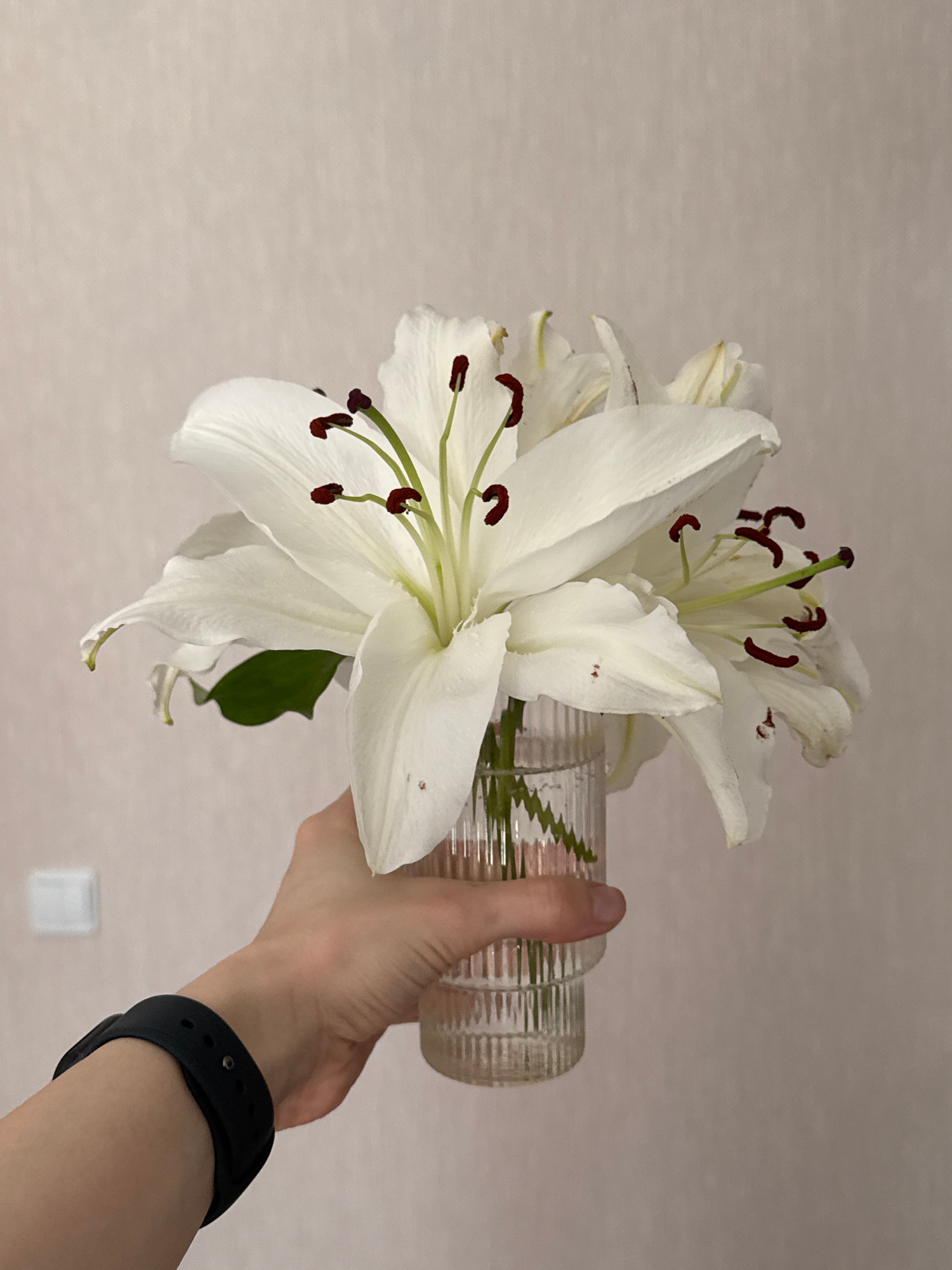 A hand wearing a black smartwatch holds a clear, textured glass vase containing white lilies with dark maroon pollen-covered stamen. The background is a plain, light beige wall. The image provides no…read more