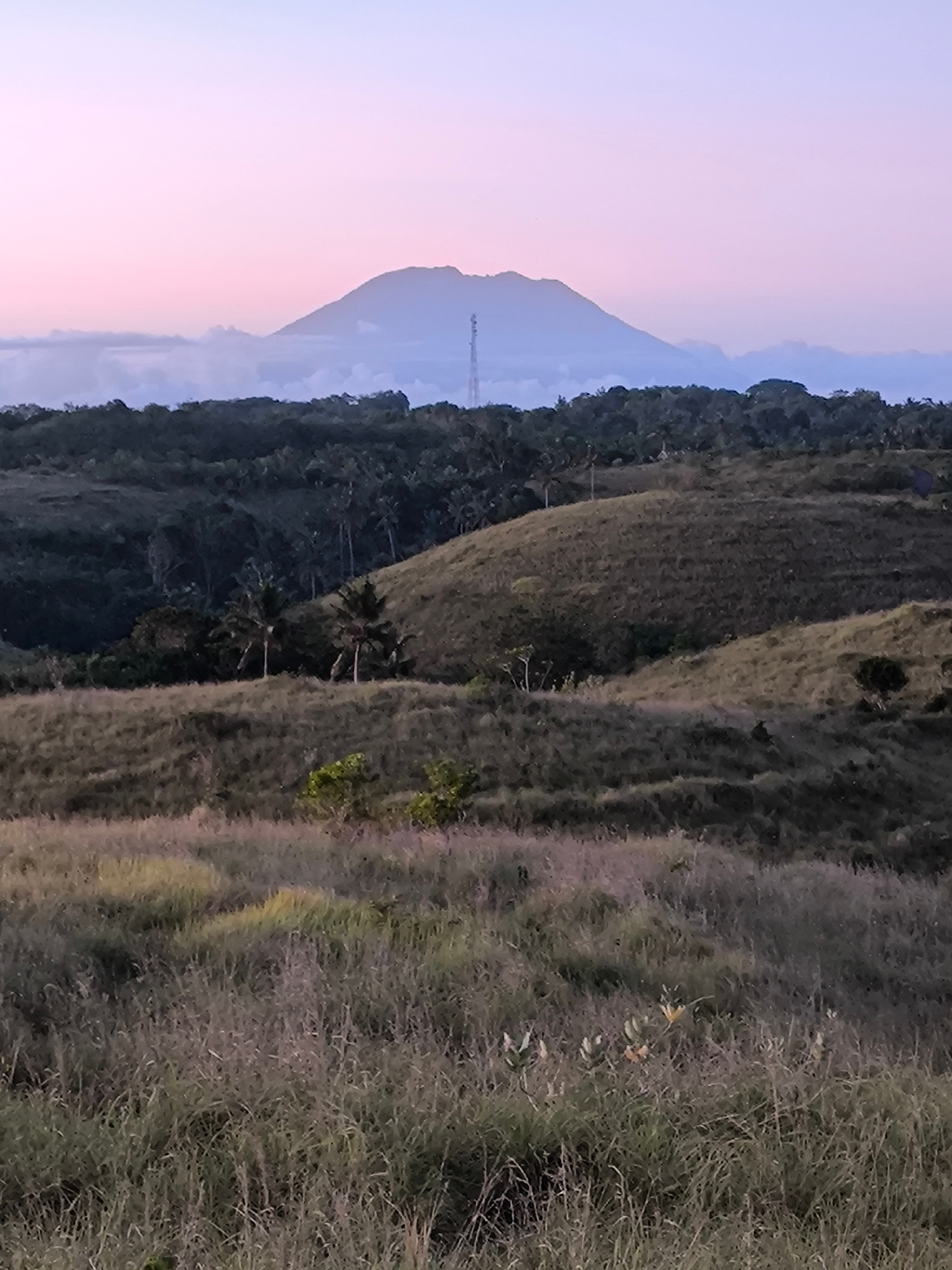 The image captures a landscape in Nusa Penida, Indonesia, at what appears to be dusk or dawn. The foreground is dominated by a field of tall, dry grass. Beyond the field are rolling hills with sparse…read more
