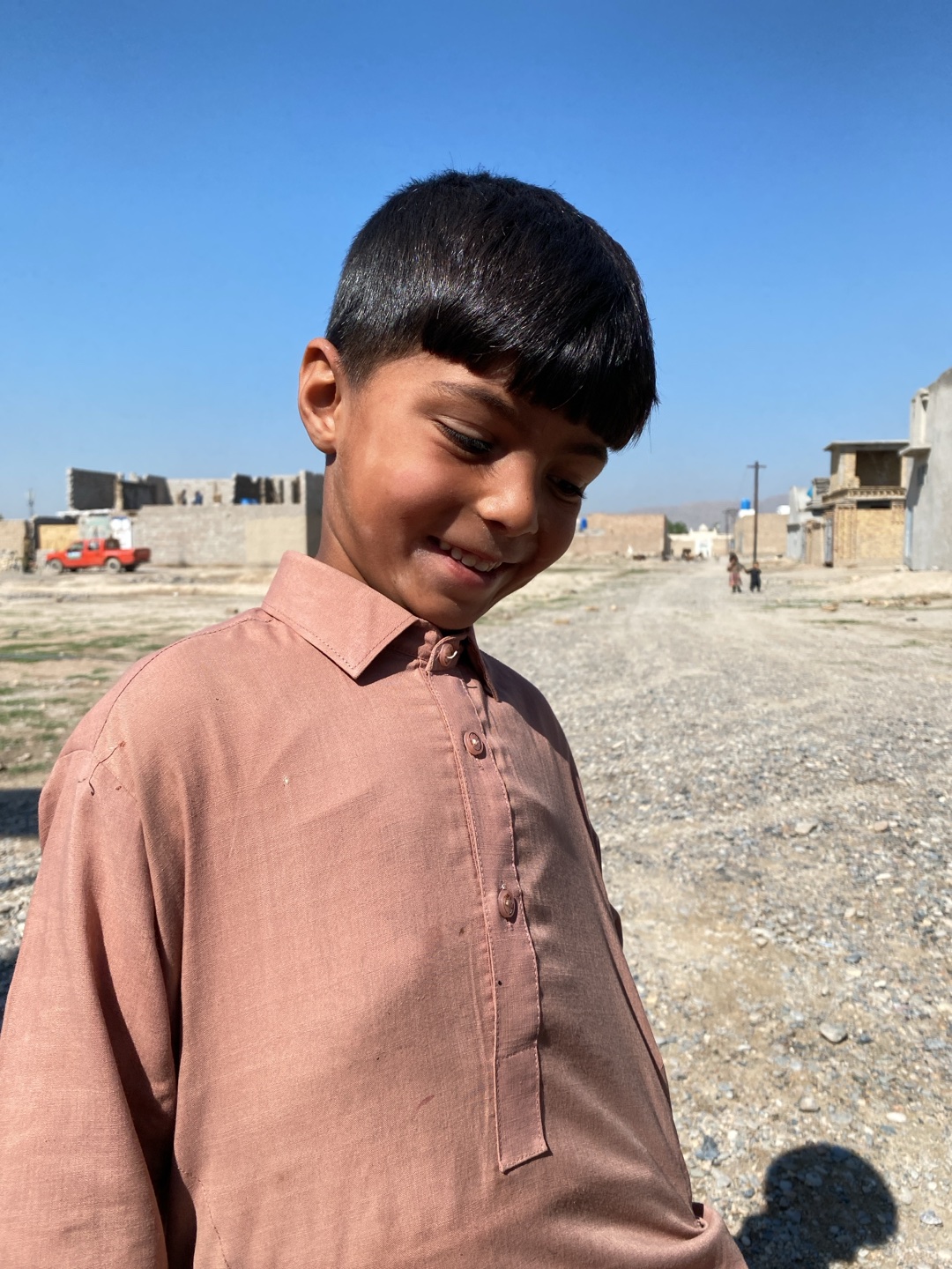 A young boy wearing a tan kurta stands on a gravel road in Kandahar, Afghanistan. In the background are sparsely populated structures under a clear blue sky. A red vehicle is visible in the distance.