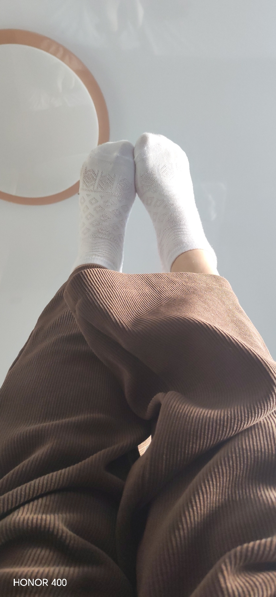 The image shows a view from the perspective of someone lying down, looking up at their feet. The person is wearing brown corduroy pants and white socks. One sock has a patterned design. Above the feet…read more
