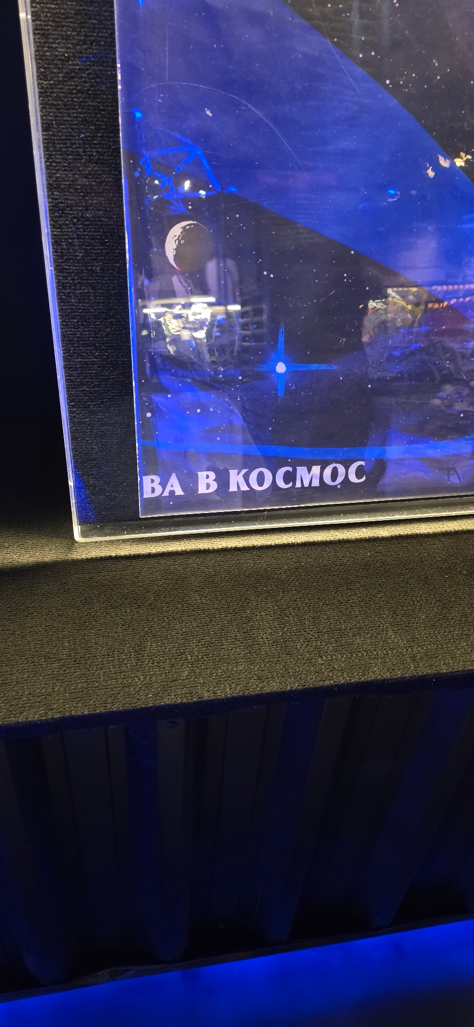 A close-up photograph shows a framed exhibit with artwork depicting space. The artwork features blue tones, celestial bodies, and possibly a rocket or spacecraft design. The Russian text "ВА В КОСМОС"…read more