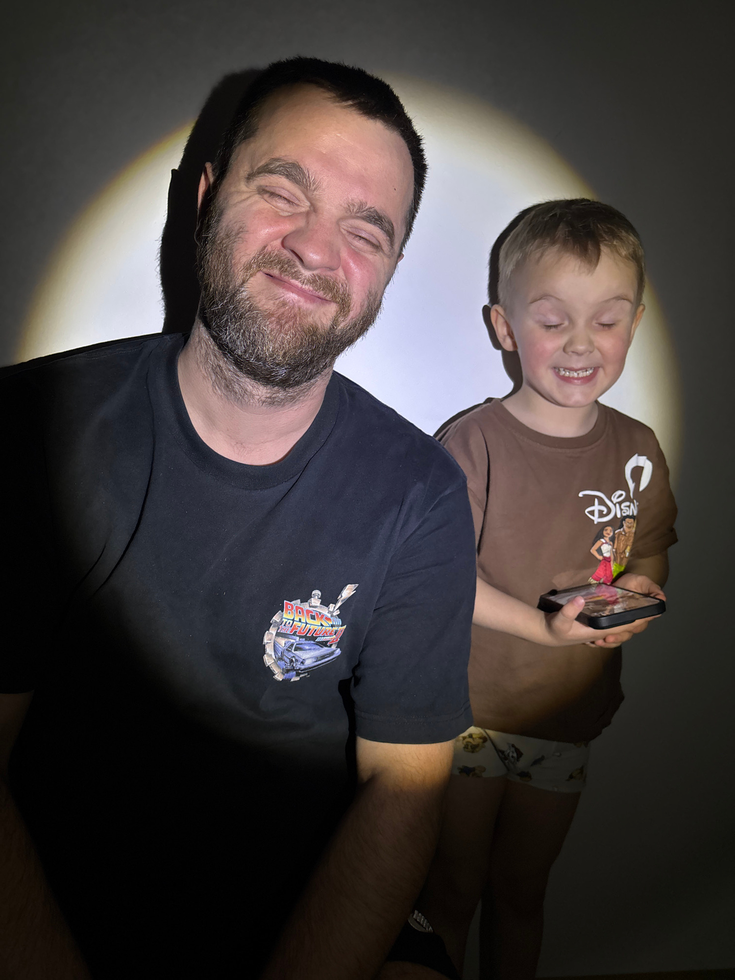 This image, taken in Chaikovsky, Russia, depicts an adult man and a young boy lying down together, captured from a rotated perspective. Both individuals are smiling broadly with their eyes squinted, s…read more
