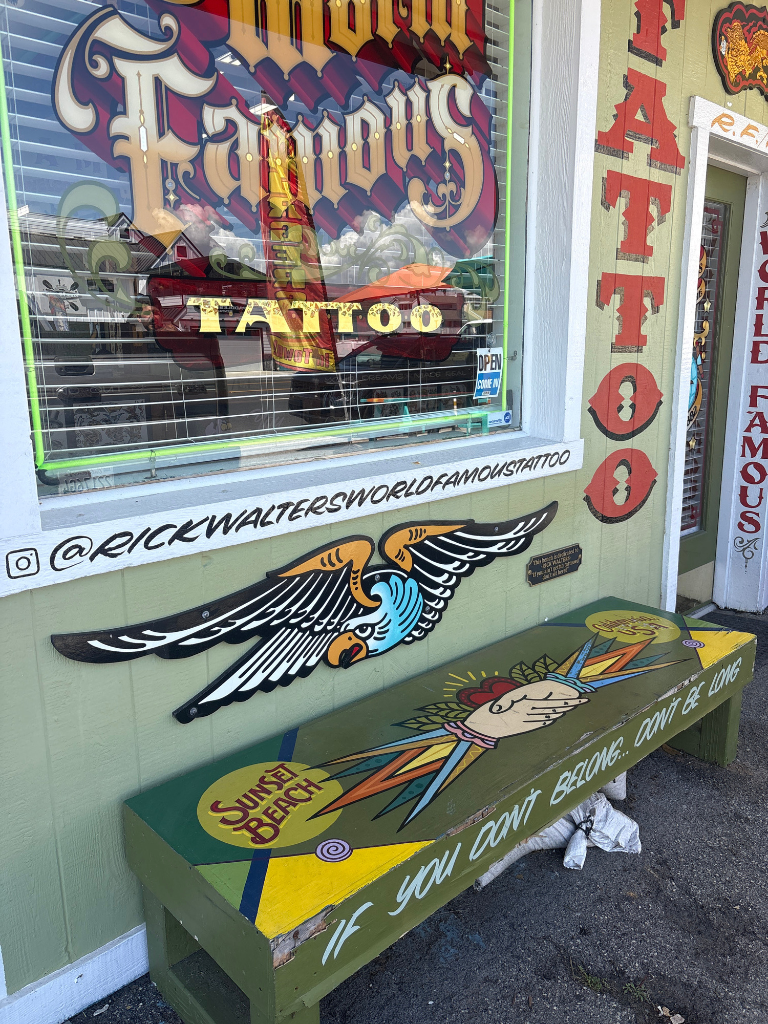 The image shows the exterior of Rick Walter's World Famous Tattoo shop in Huntington Beach, California. A red sign reading "TANNOUS" is partially visible above the shop's window, which has signs adver…read more