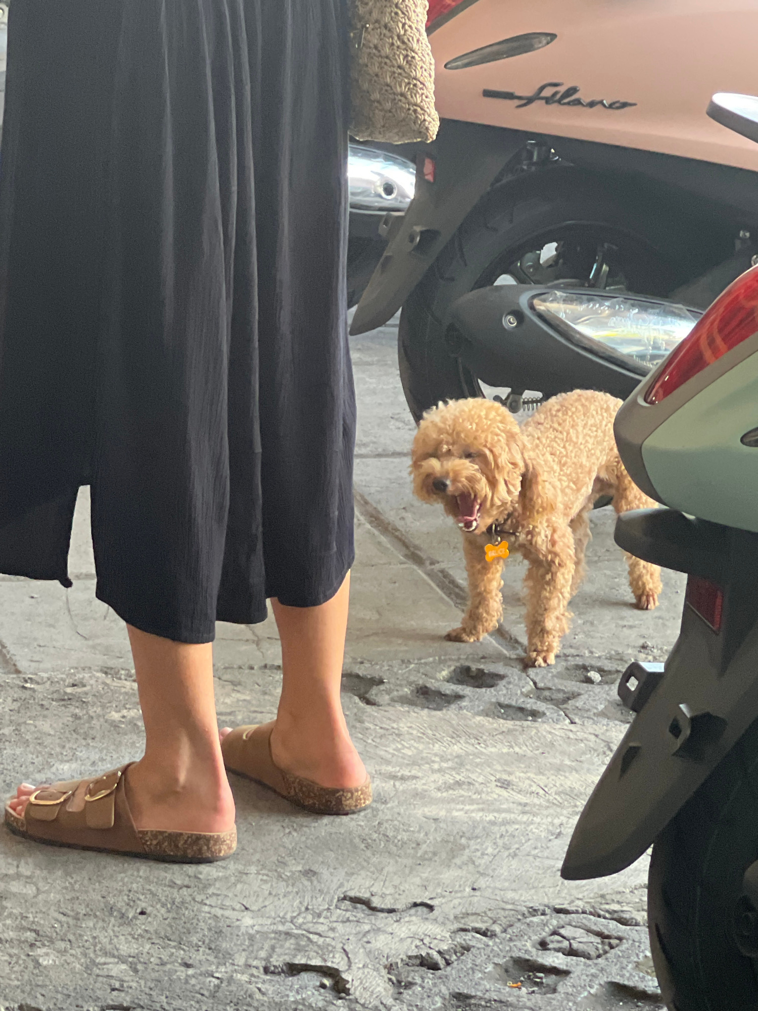 Observed in the Ubud District, Indonesia, the image captures a scene from an eye-level perspective. It centers on a person's lower torso and legs, attired in a black ankle-length skirt. The person's f…read more