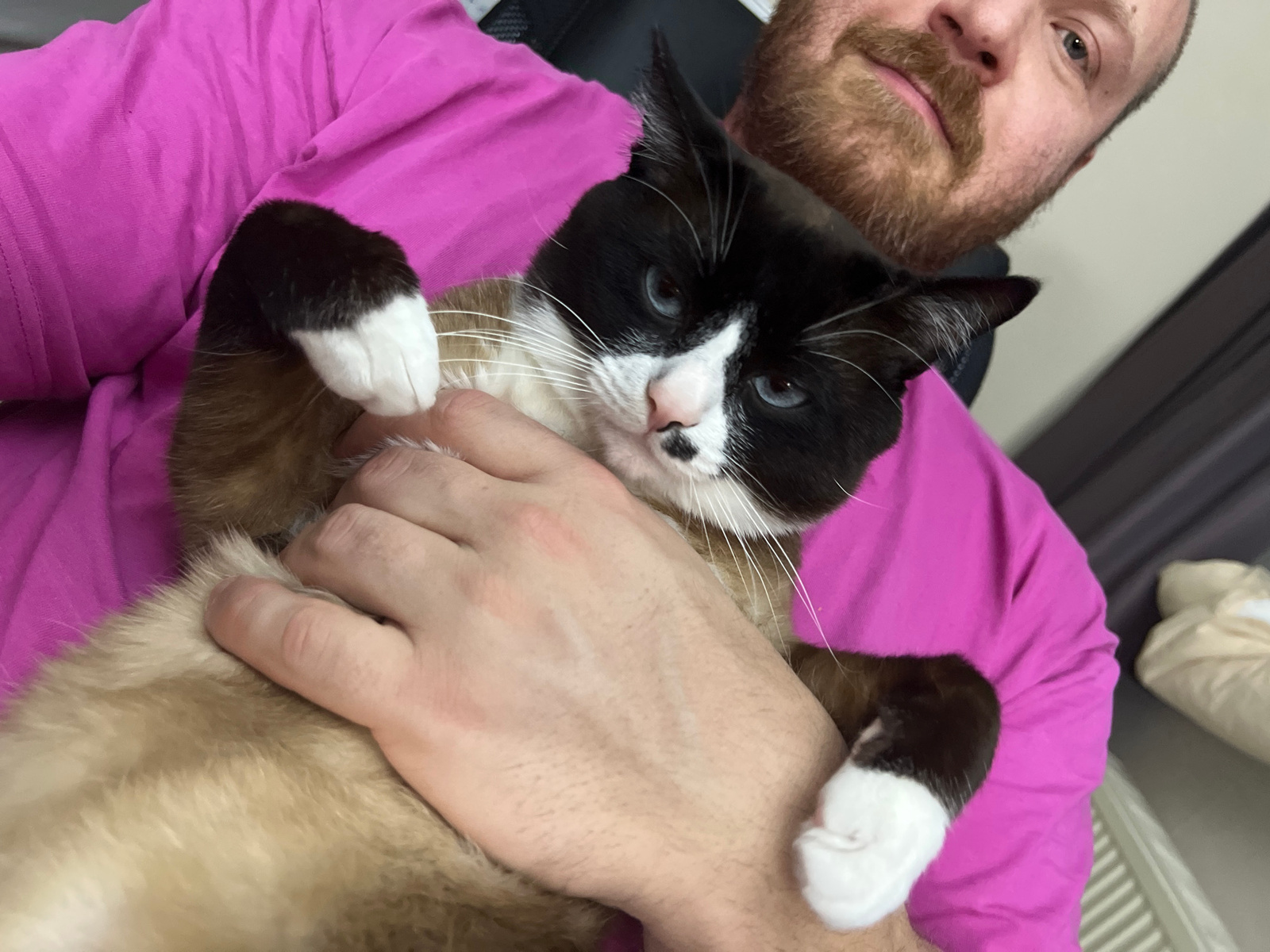 The image depicts a male individual holding a cat in an indoor setting in Noviy, Russia. The man is visible from the chin upwards, featuring fair skin, a reddish-brown beard and mustache, and light-co…read more