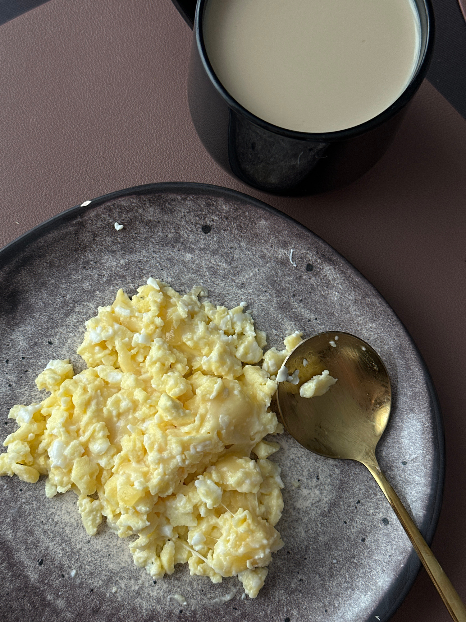 The image depicts a breakfast scene. A black mug filled with a beige liquid is positioned to the left of a speckled gray plate containing scrambled eggs. A gold-colored spoon rests atop the eggs. The…read more