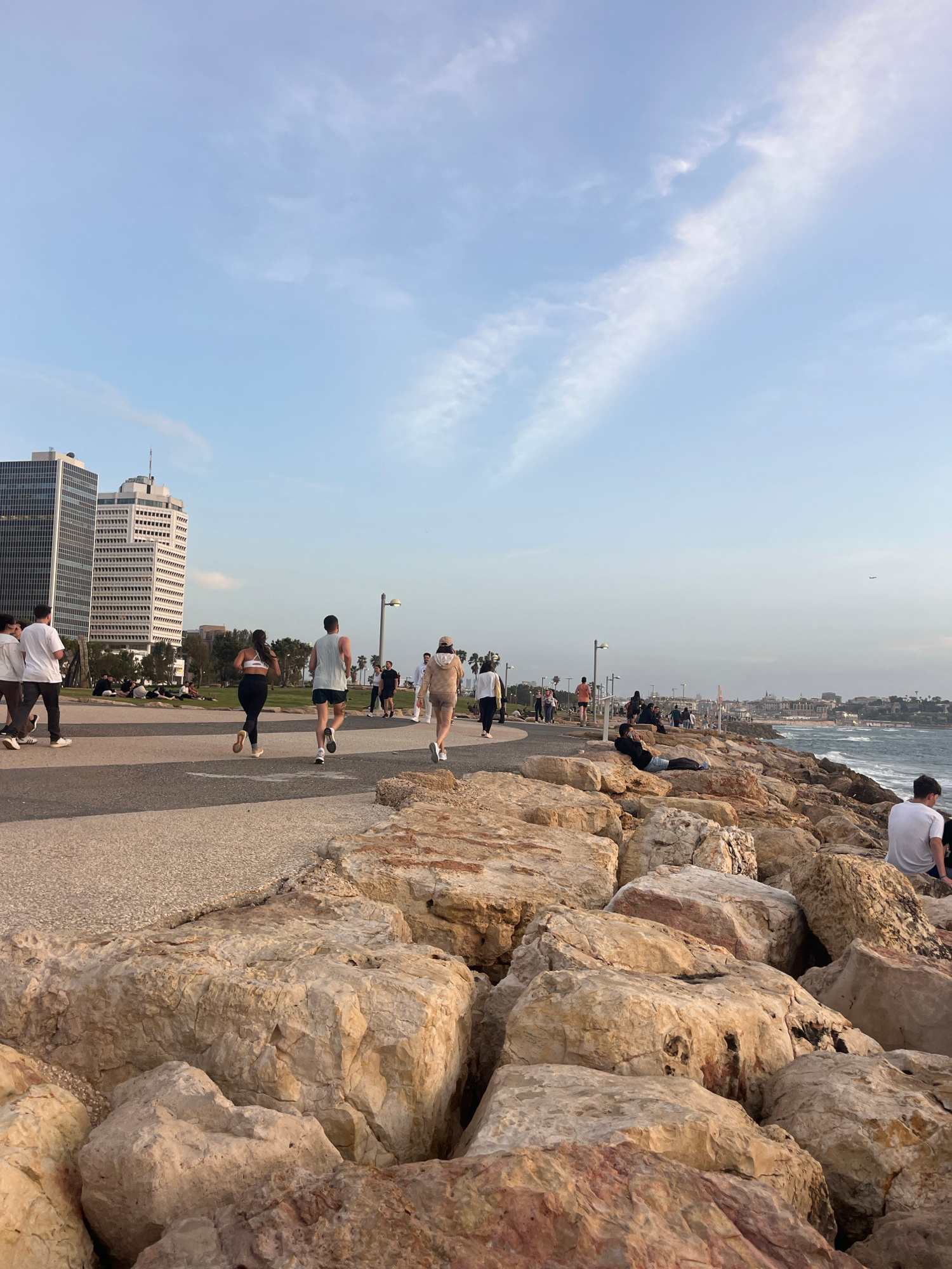 The image depicts a coastal scene in Tel Aviv, Israel. A wide paved pathway runs along the right side, bordered by large, light-colored rocks that separate it from the sea. People are walking, jogging…read more