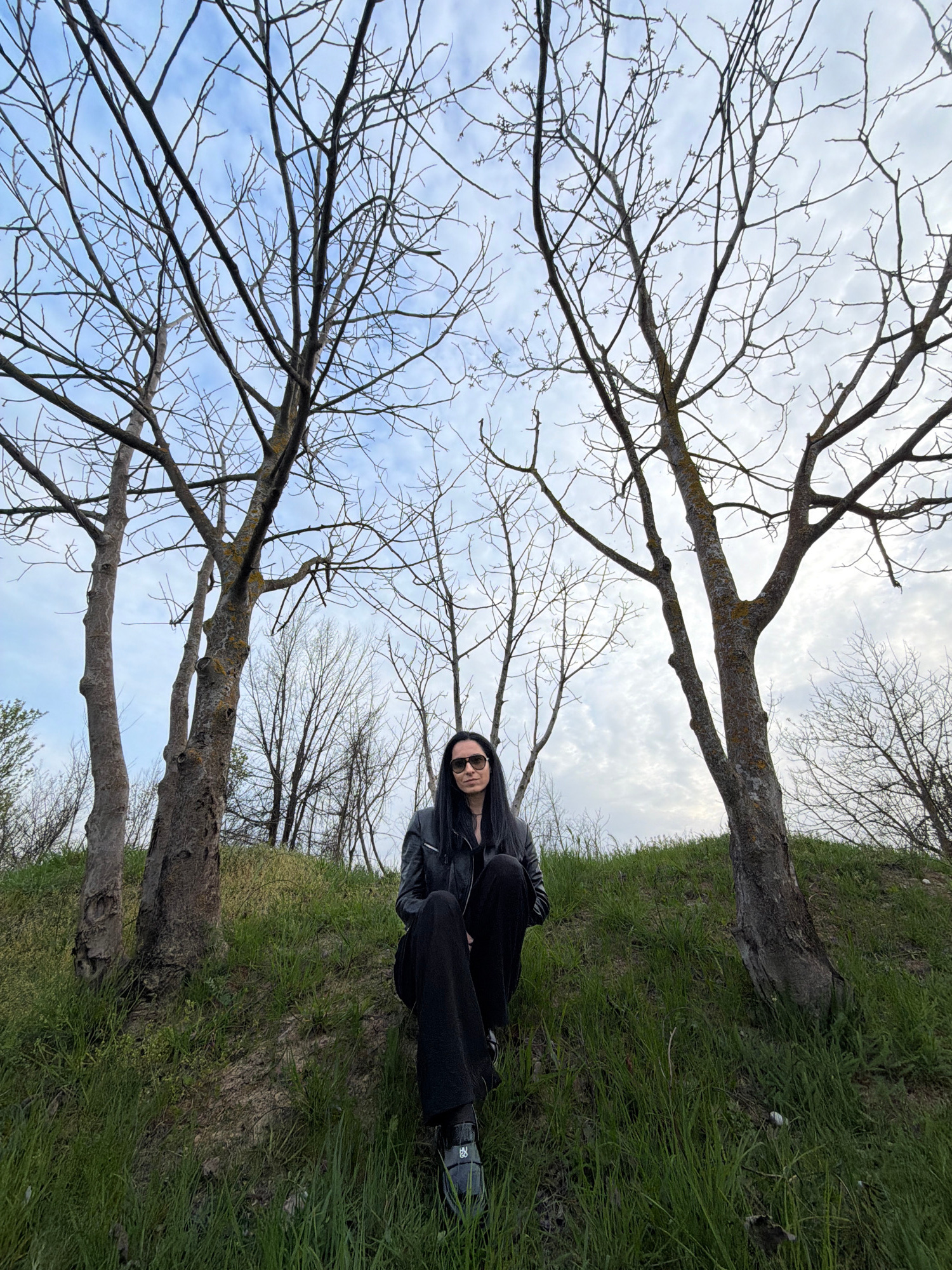 A person wearing black clothing and sunglasses is sitting on a grassy area between two bare trees. The sky is visible through the branches of the trees, and the overall environment appears to be outdo…read more