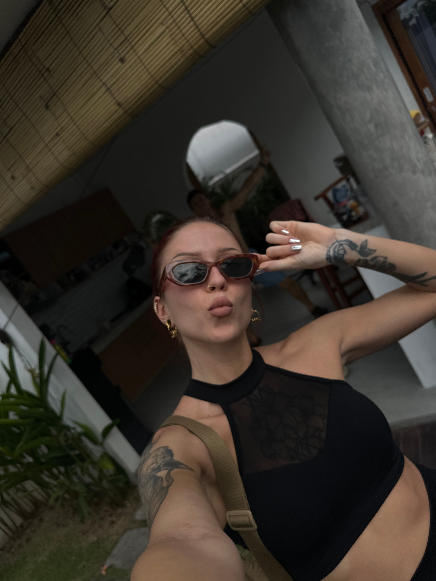 A selfie from North Kuta, Indonesia, shows a woman in a black top and sunglasses. She is indoors near a bamboo-like screen, with glimpses of greenery visible. She has visible tattoos on her arms and gā¦read more