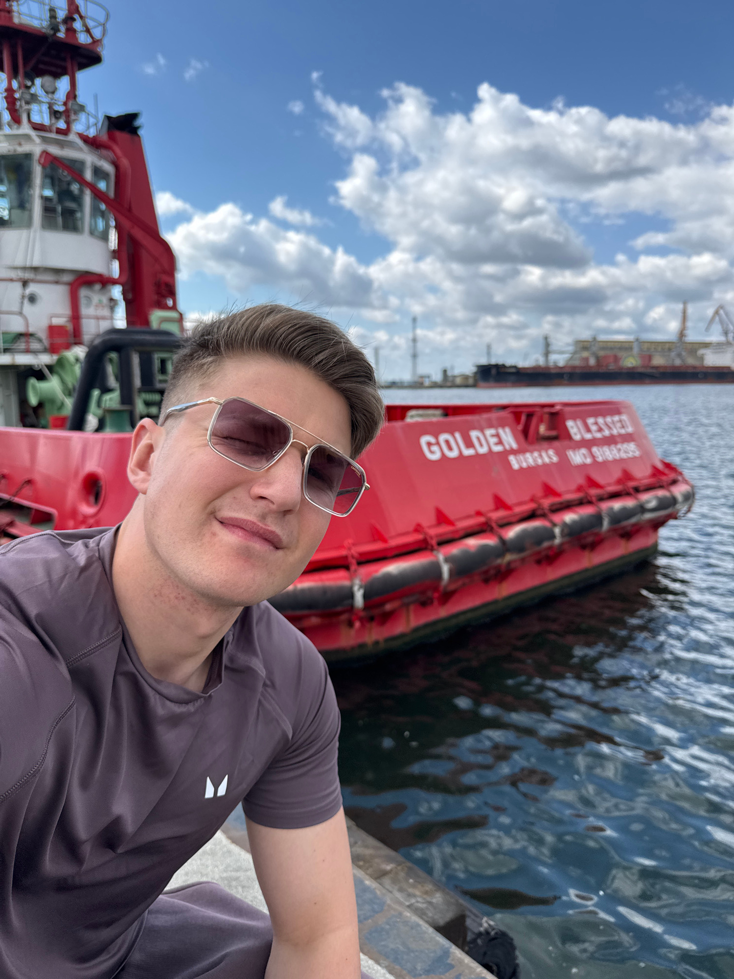 A man wearing sunglasses and a dark-colored athletic shirt with a white logo on the left side of the chest is taking a selfie. In the background, there is a red vessel named "GOLDEN BLESSED BURGAS" wi…read more