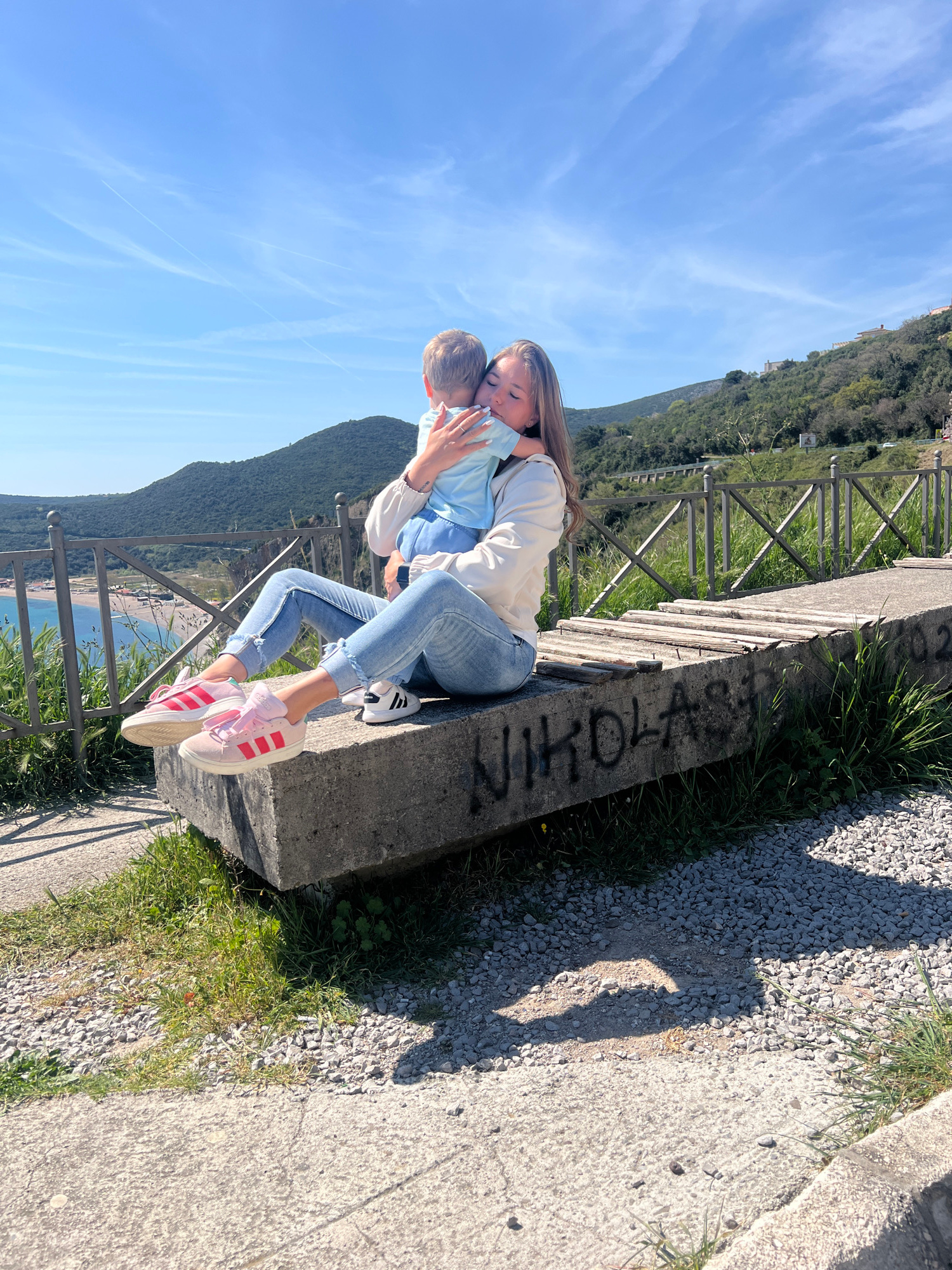 A woman in a white sweater and blue jeans sits on a concrete ledge overlooking a coastal landscape. She cradles a young child in her arms. The background features green hills, a beach, and a blue sky…read more