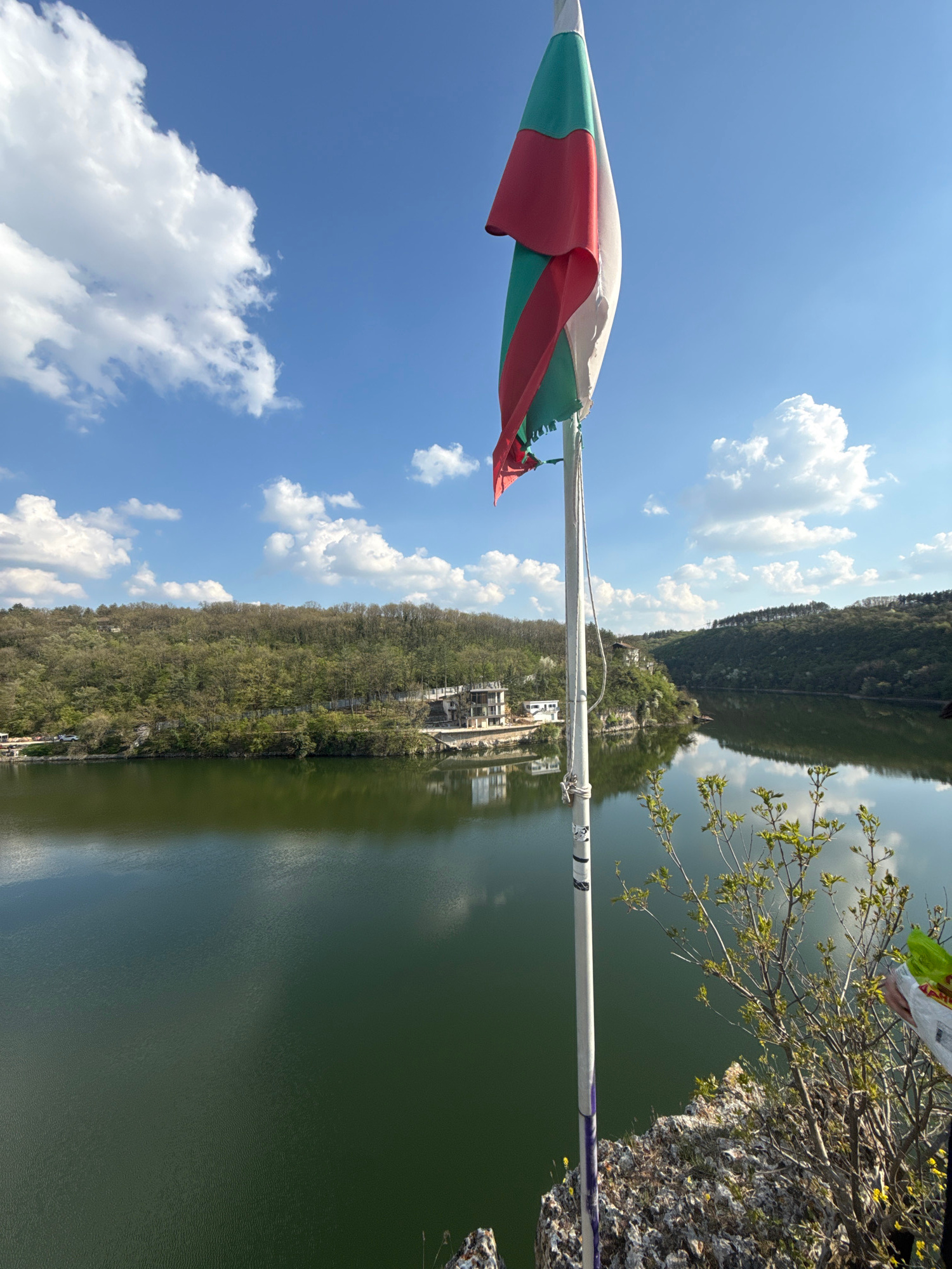 This image, taken in Pleven, Bulgaria, captures a scenic daytime landscape featuring a body of water and distant hills, with the Bulgarian flag prominently displayed in the foreground. The frame is d…read more
