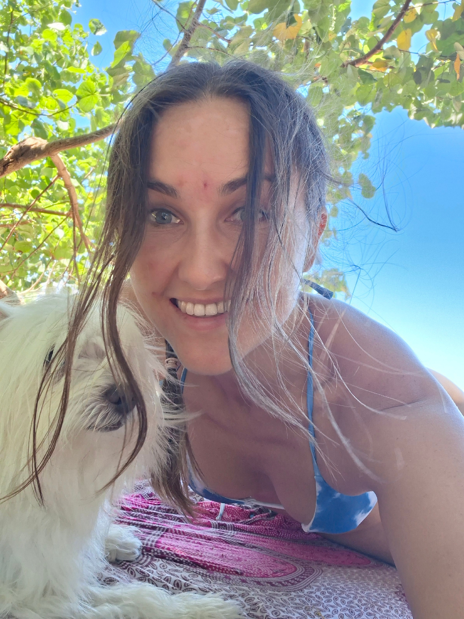A woman is lying on a patterned blanket with a white dog nestled against her. She is wearing a blue bikini top. The sky and foliage are visible in the background. The location is most likely Denpasar,…read more