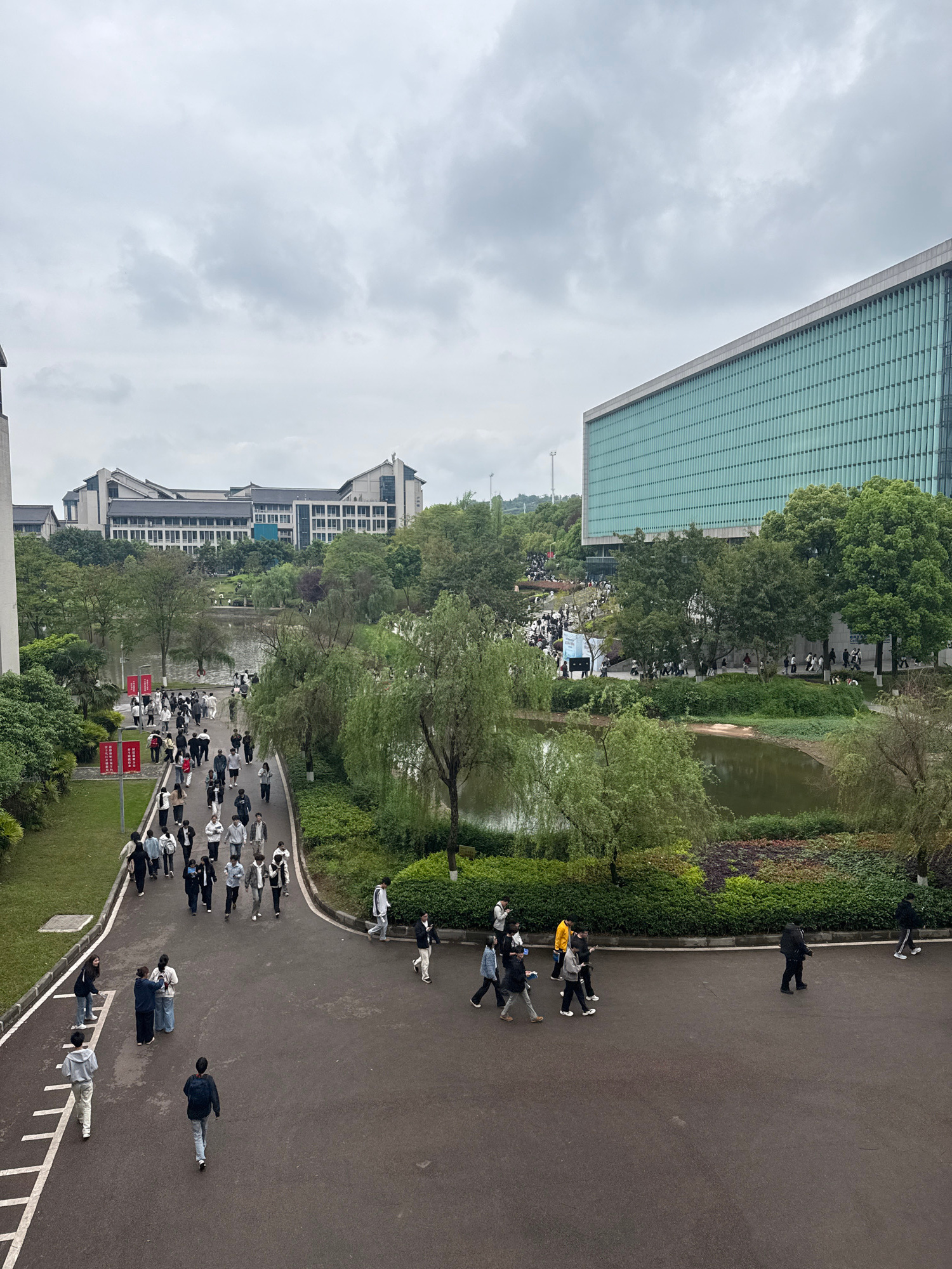 The image presents an aerial view in Jiangjin, China. A body of water divides a walkway and adjacent structures. A large group of people, many wearing black and white attire, is walking along the walkway. There is a large, modern building to the upper left with a grid-like exterior. Along the water, there are trees and dense vegetation. There are multiple buildings across the water, appearing to be part of a complex. Signs with Chinese writing are visible on the lower left. The sky is overcast. | Open Wire