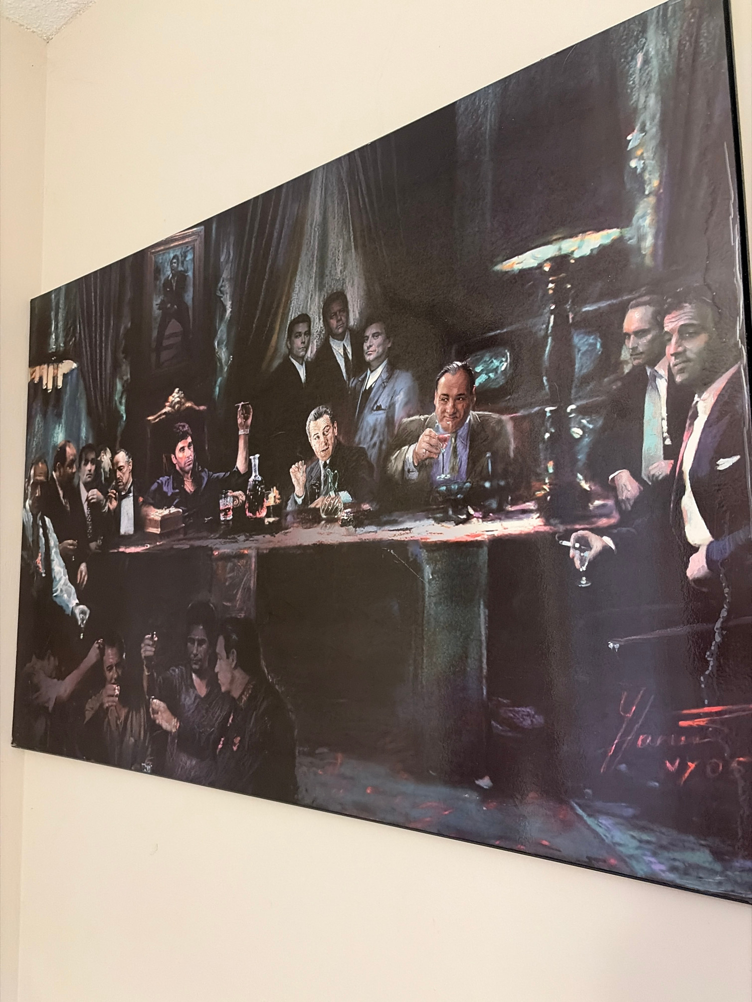 The image depicts a reproduction of a painting hung on a light-colored wall. The painting shows a crowded scene inside a dimly lit room. Numerous men are seated or standing around a long table. Some m…read more