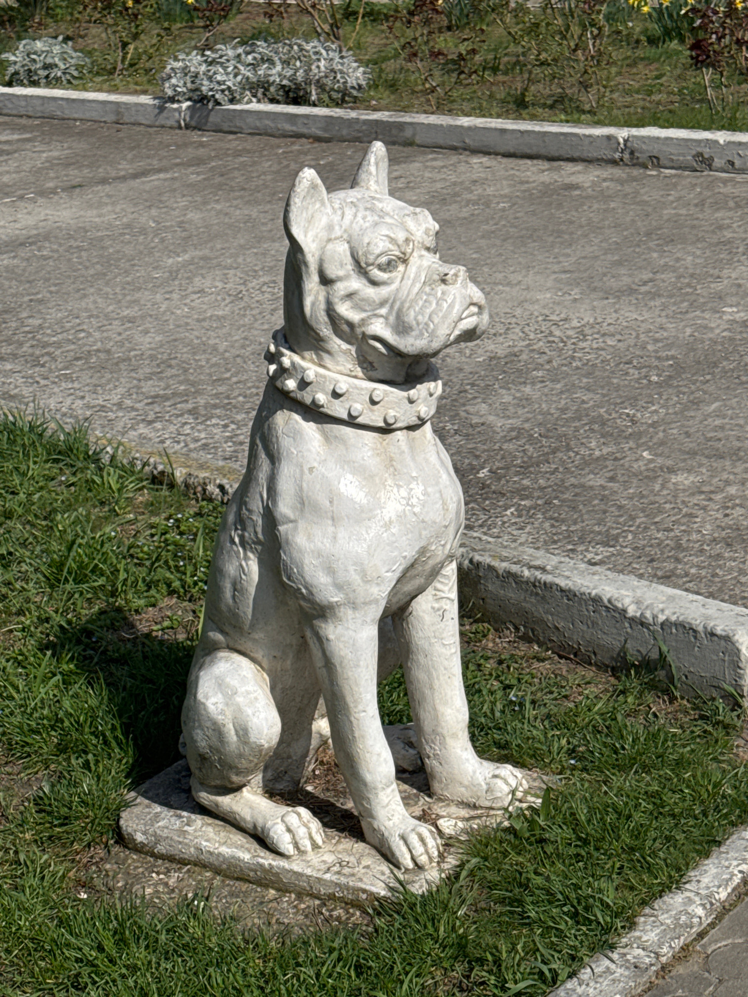 The image shows a white, concrete bulldog statue lying on its stomach in a grassy area. The statue has a studded collar and is positioned near a concrete pathway and curb. The background includes gras…read more