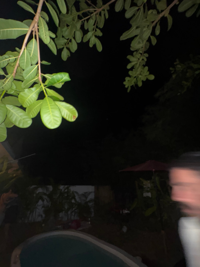 The scene depicts an outdoor area at night in Moo 4, Thailand. The upper portion of the image is dominated by green tree branches bearing numerous leaves, with one leaf on the left exhibiting a reddis…read more