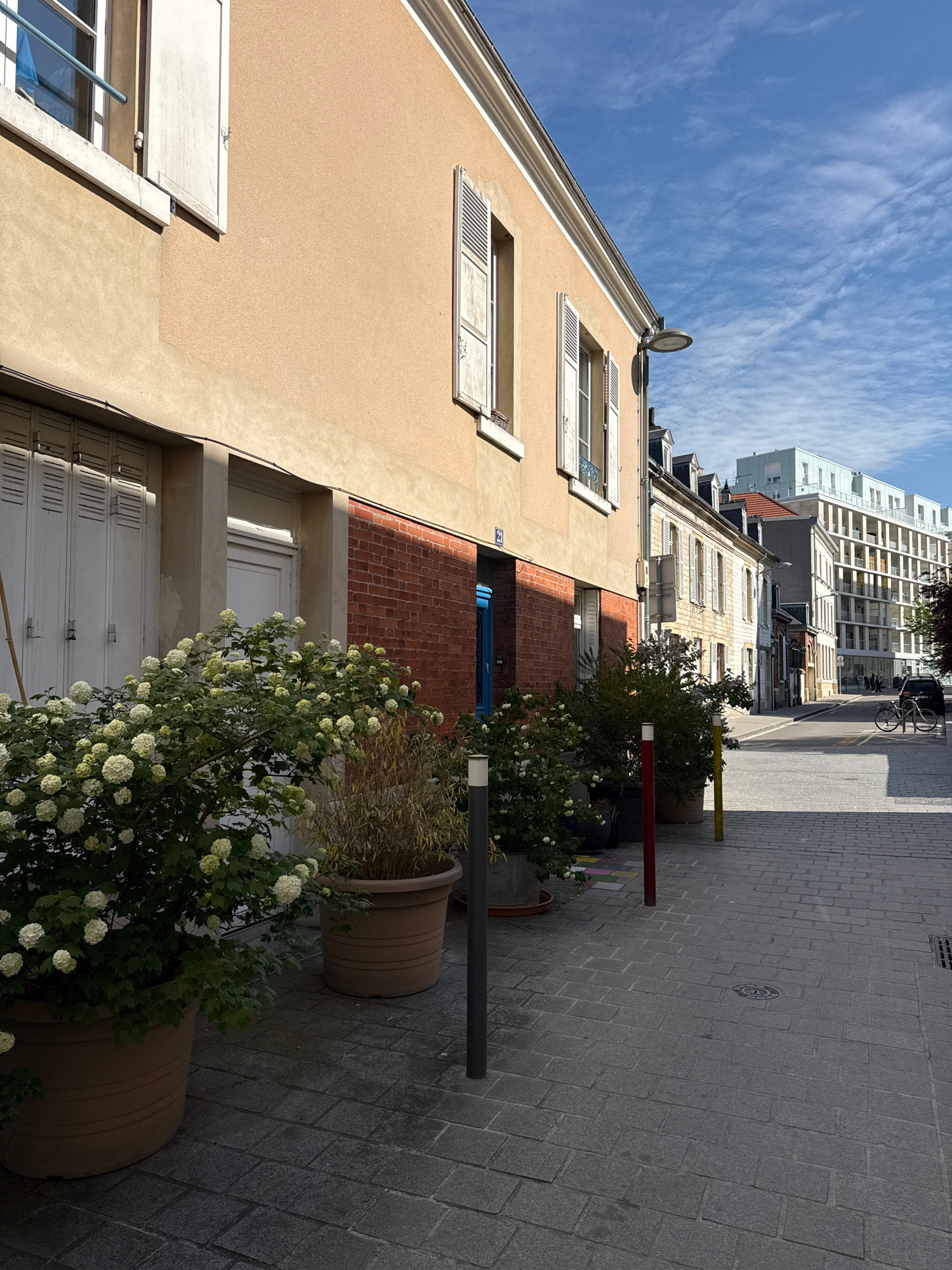 This outdoor, angled shot captures a street scene in Reims, France. The foreground is dominated by two large, brown flower pots overflowing with leafy bushes, some with white blooms, positioned on the…read more