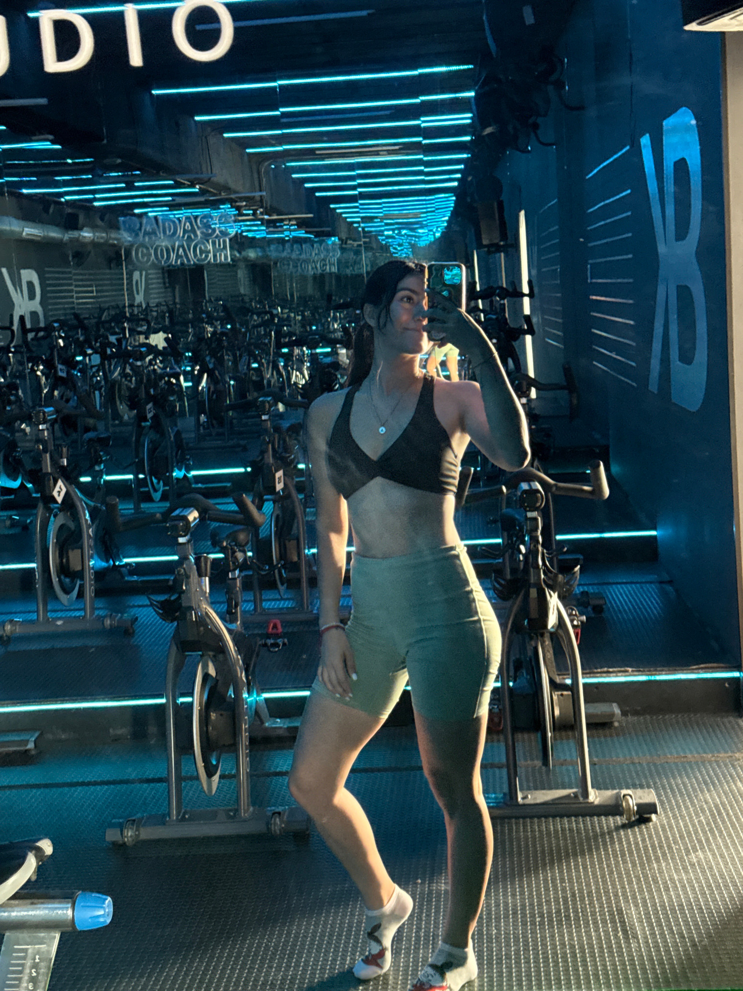 A woman in athletic wear takes a selfie inside a fitness studio in Puebla, Mexico. The studio has rows of stationary bikes, and is lit with blue lighting. "Studio Coach" is on the side wall.