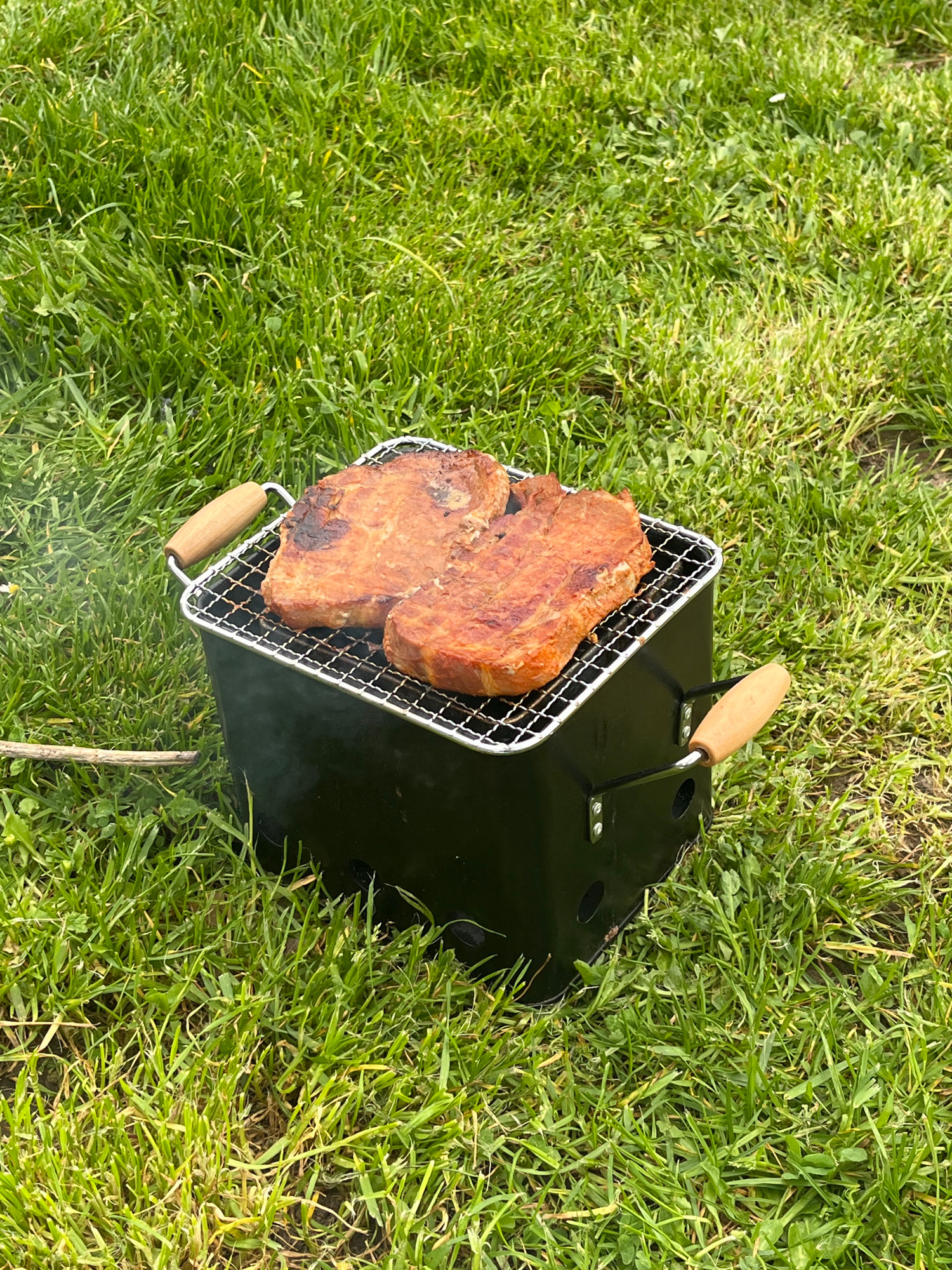 The image captures a small, black, portable grill placed directly on vibrant green grass in an outdoor setting. Two substantial pieces of meat, likely pork chops or similar cuts, are cooking or have j…read more