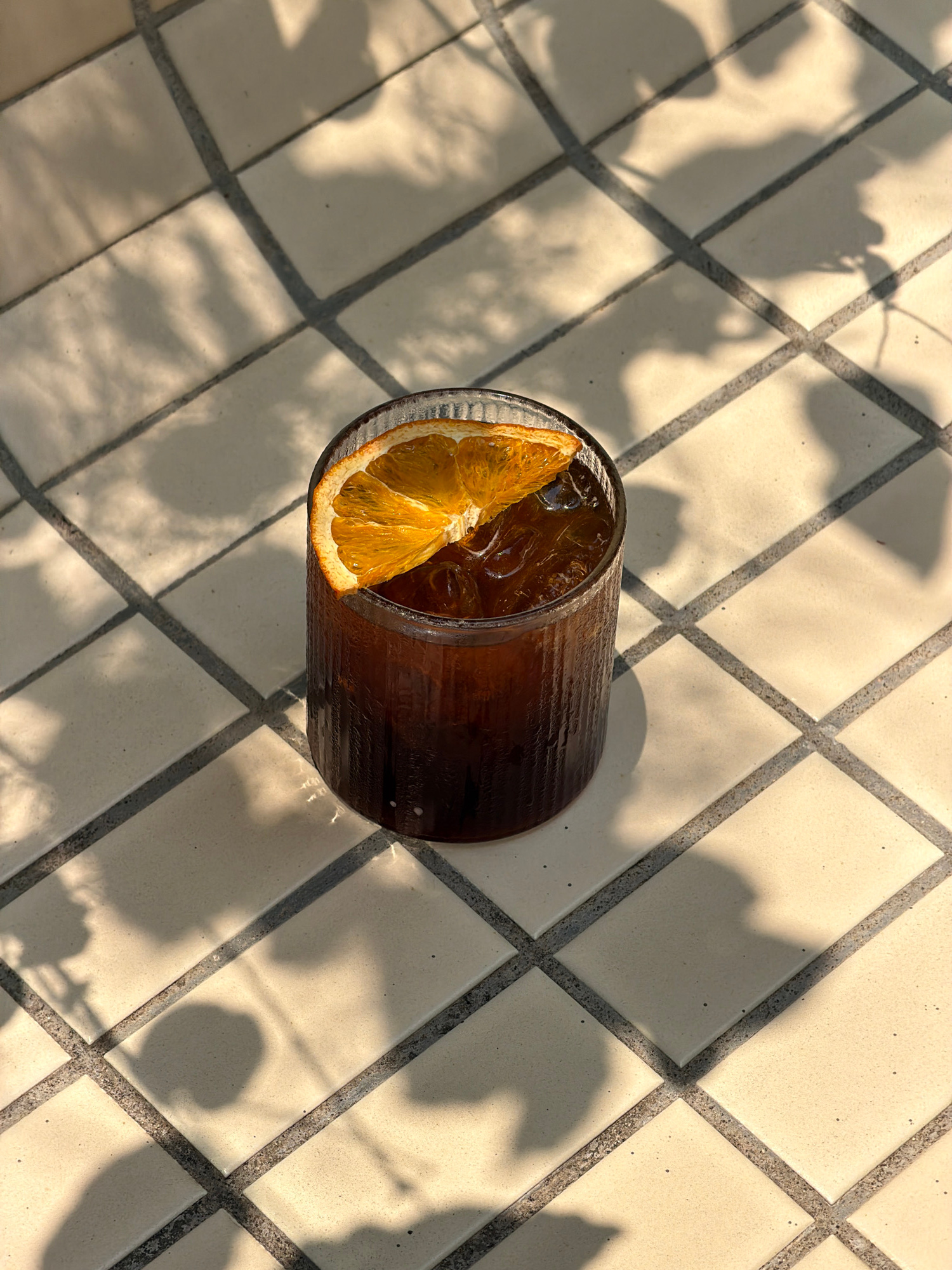 A high-angle shot shows a clear, textured glass of dark liquid with ice and an orange slice, resting on a light-colored tiled surface with dark grout lines. Shadows of leaves or foliage are cast acros…read more