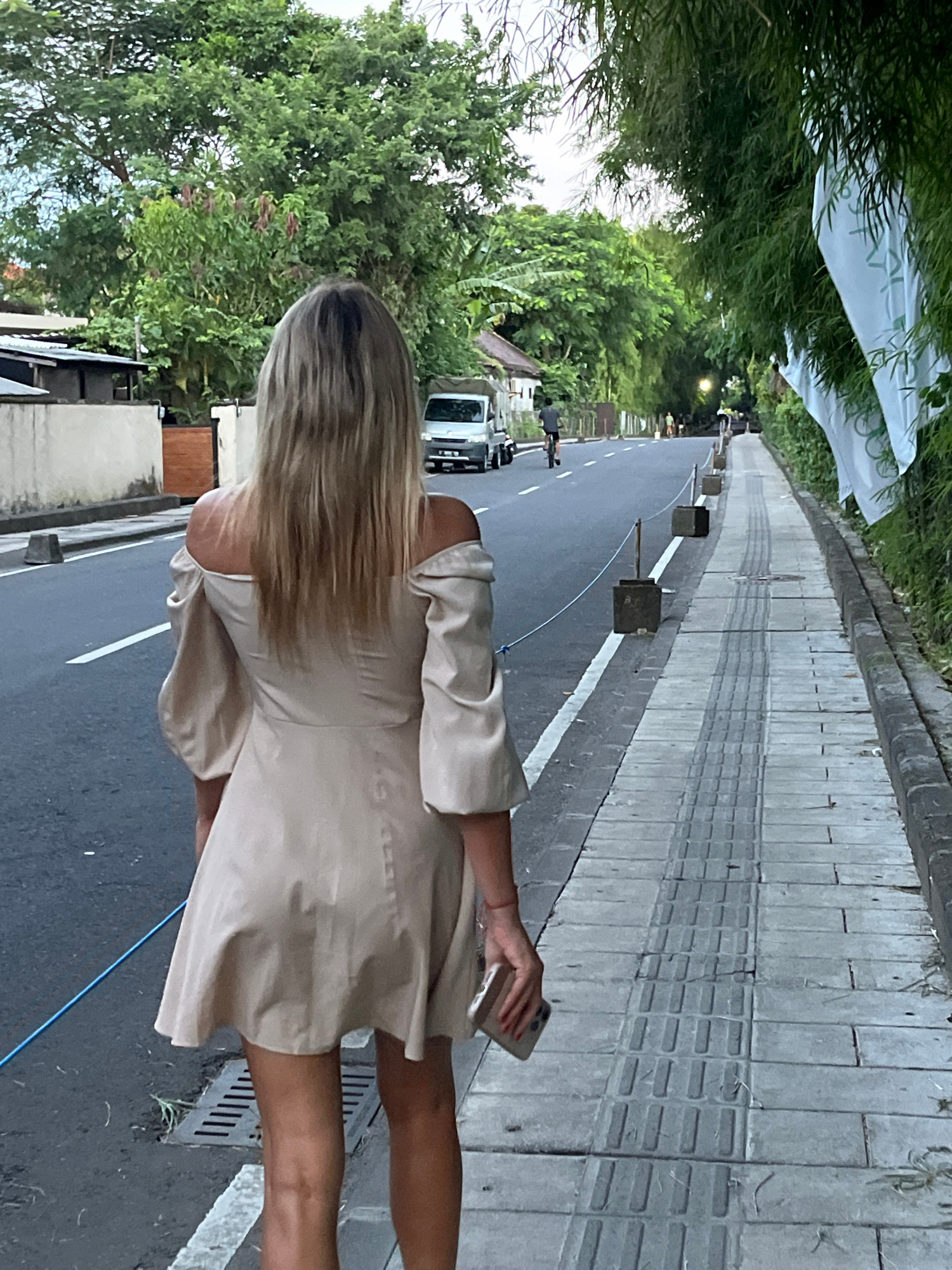 A woman with long blonde hair, dressed in a light-colored dress, walks along a street in the city of Unknown, Indonesia. She holds a mobile phone in her hand. The street is bordered by sidewalks and a…read more