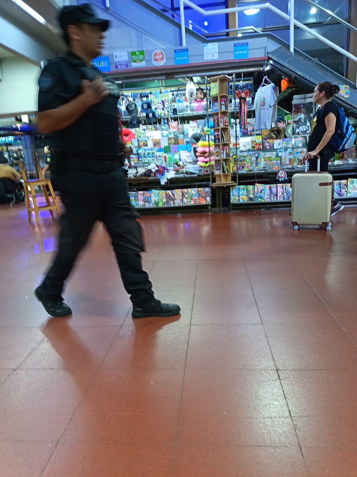 A male security guard walks left across a red-tiled floor in what appears to be the Retiro train station in Buenos Aires, Argentina, given the shops and the signs with the word "SUBE." The guard is we…read more
