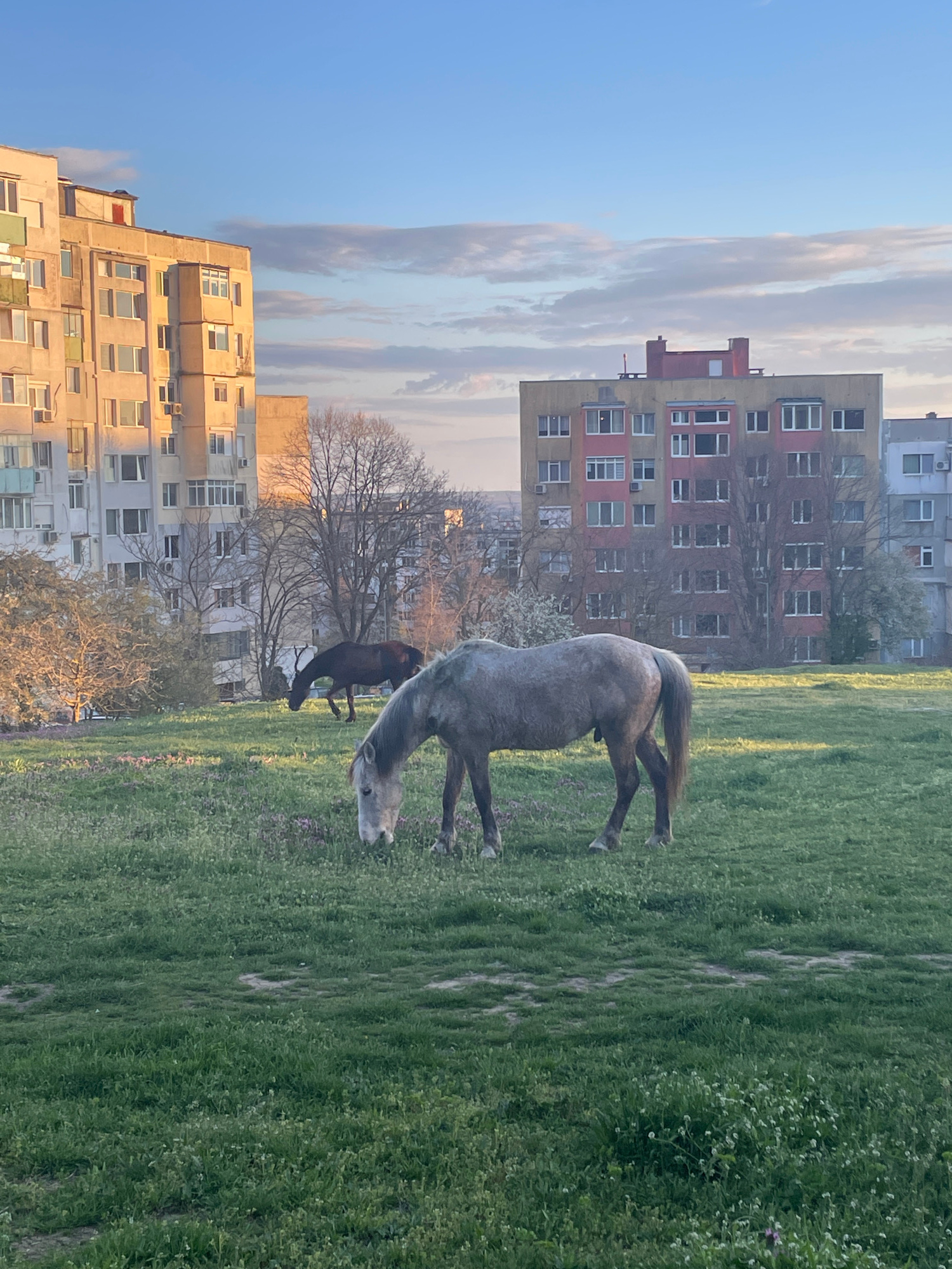 A long, slightly angled shot of a field in Varna, Bulgaria. In the field, two horses are grazing; the one closer to the camera is gray, and the other is dark brown. Behind them are a few bare trees. B…read more