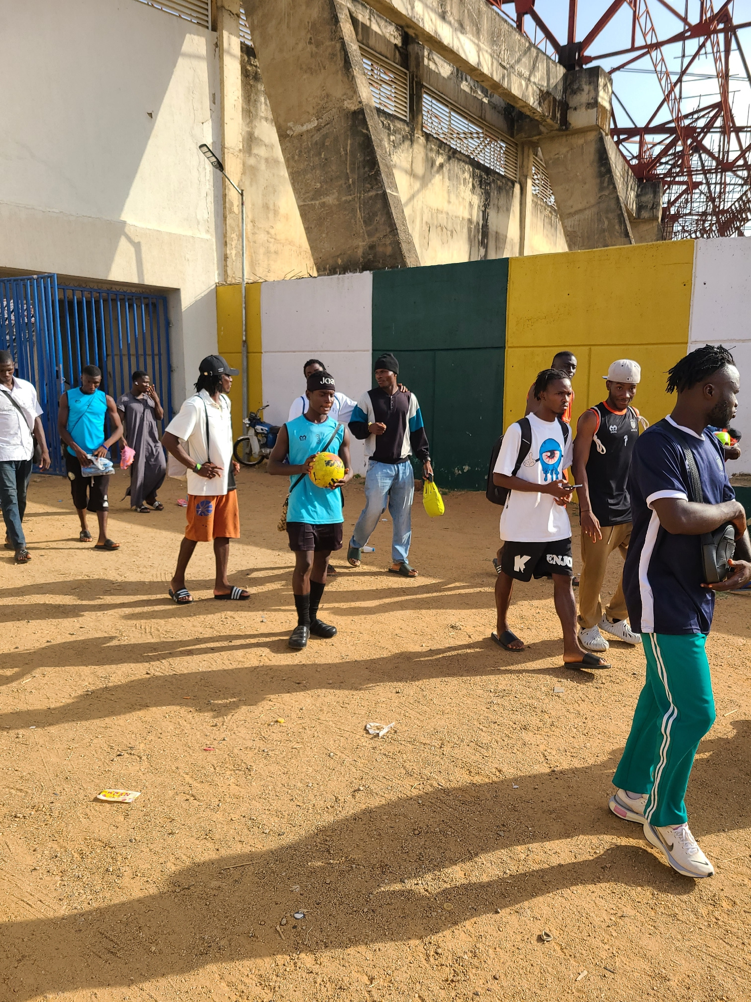 A group of people is standing outside the New Stadium in Nigeria. The stadium structure is visible in the background, including parts of a red metal structure and a concrete wall with rectangular open…read more
