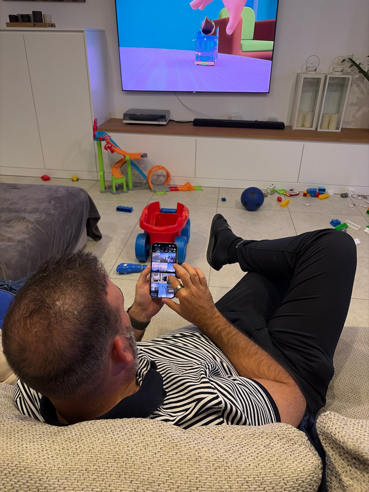 A man with grey hair and a striped shirt is lying on a grey couch, holding a smartphone and facing a television screen. The TV is showing a cartoon. The man is wearing black pants and black socks. A b…read more