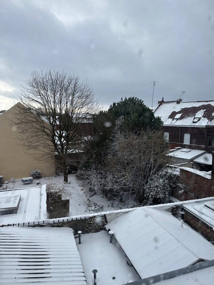 This image displays a snow-covered residential area in Wattrelos, France, under an overcast sky. The scene is viewed from an elevated perspective, likely from an upper window or balcony. In the foreg…read more