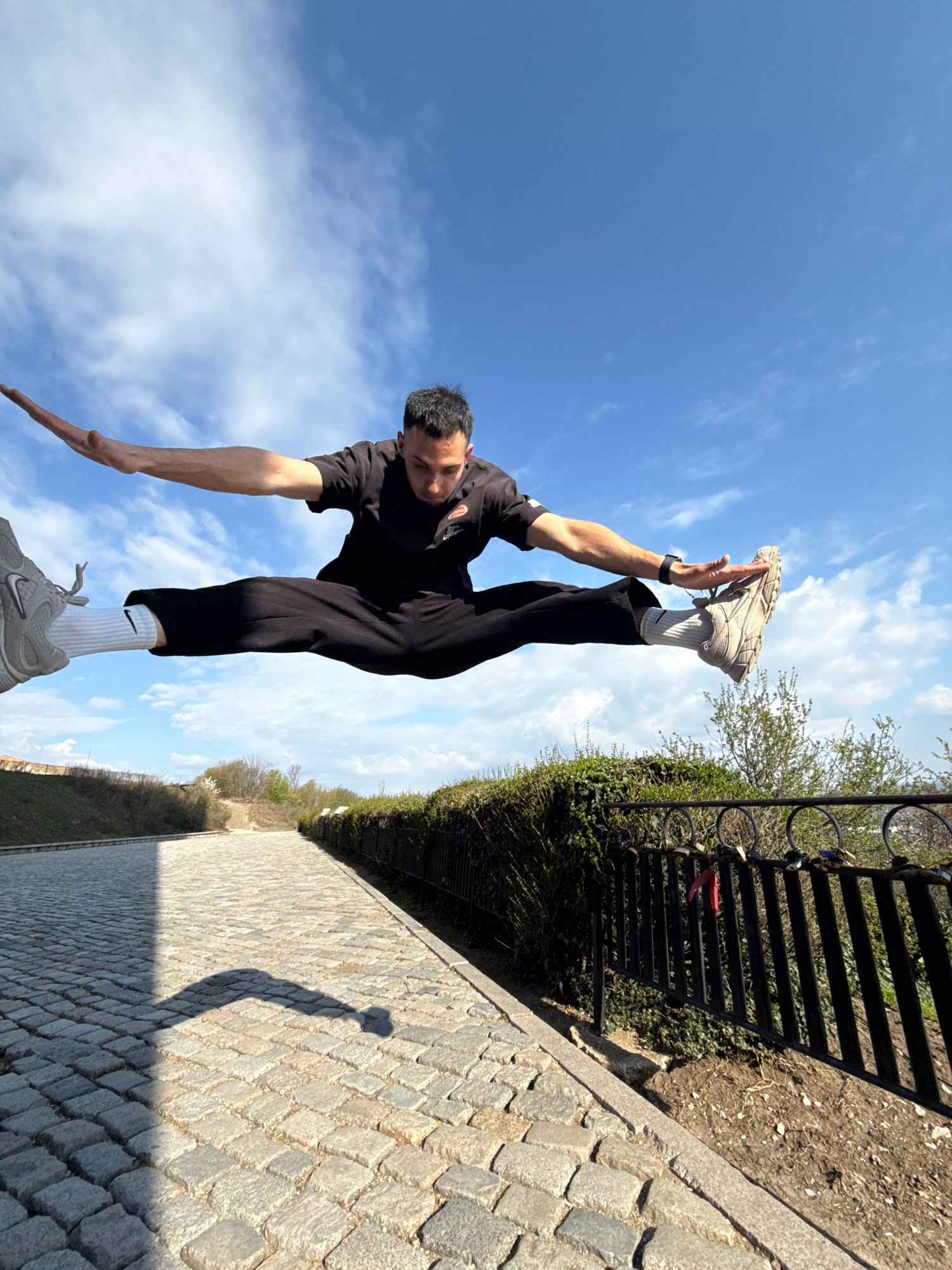A man is performing a gymnastic move outdoors on a sunny day with a blue sky and scattered clouds. He is wearing black pants, a black t-shirt, white socks with the Nike logo, and gray sneakers. He isβ¦read more
