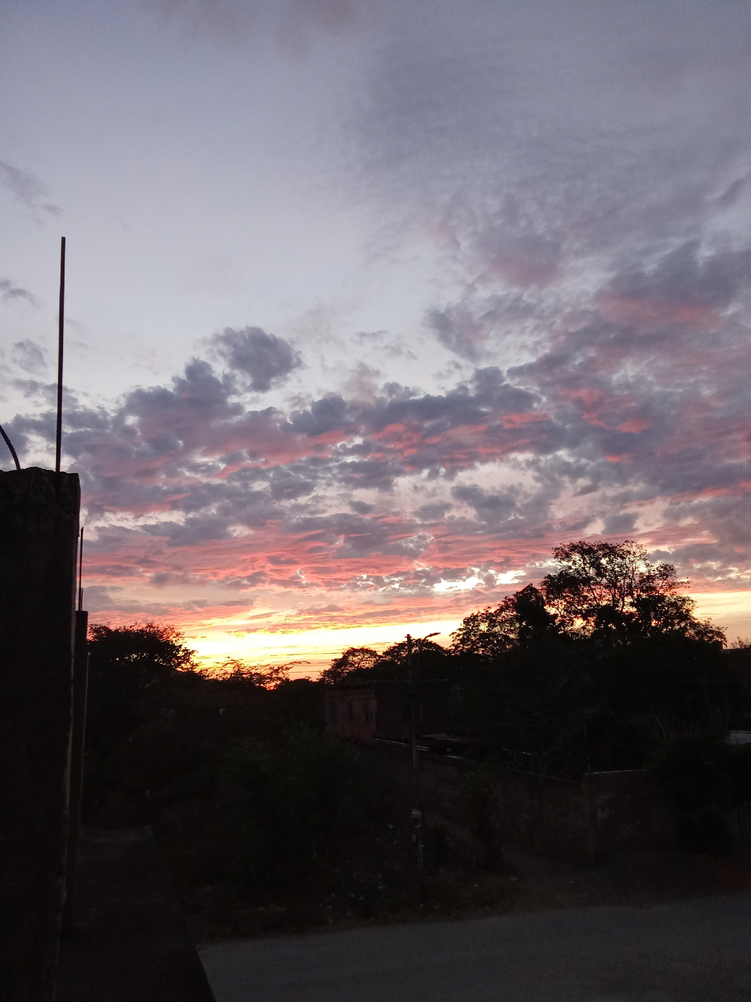 The image depicts a sunset in Juan Griego, Venezuela. The sky is filled with clouds that are colored with pink and grey hues. The sun is setting behind trees, creating a silhouette effect. In the fore…read more