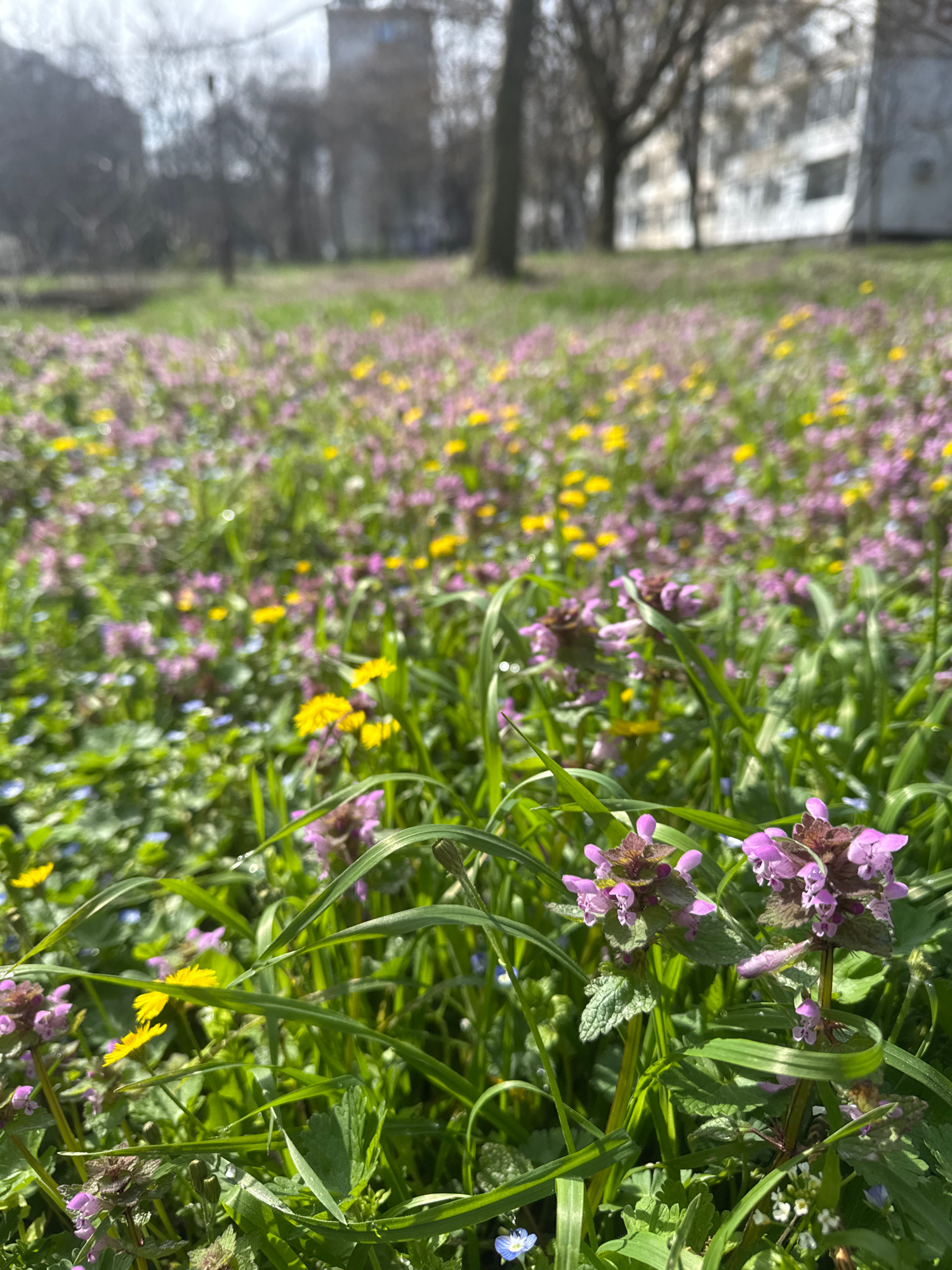 The image shows a field of wildflowers in Burgas, Bulgaria, near a body of water and a building. The predominant colors are green, purple, and yellow from the various flowers and grass. Purple dead-neβ¦read more