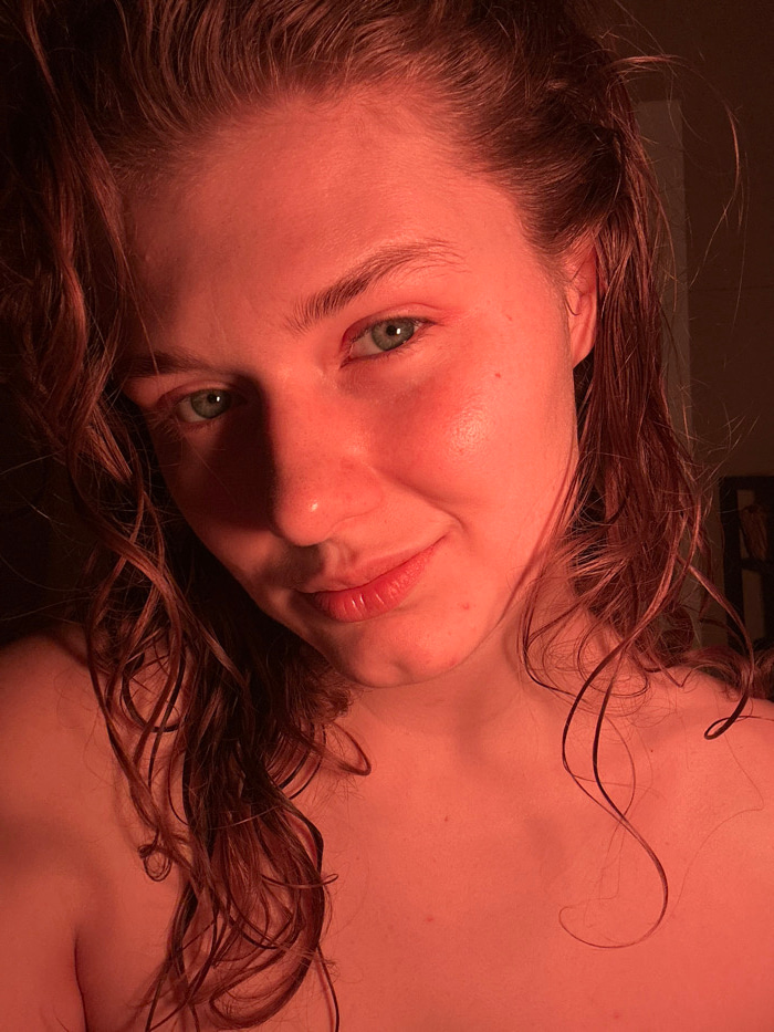 A close-up, chest-up portrait depicts a female subject with light skin, wet, wavy reddish-brown hair, and green eyes, illuminated by strong red light. Her face is turned slightly to the right, and she…read more