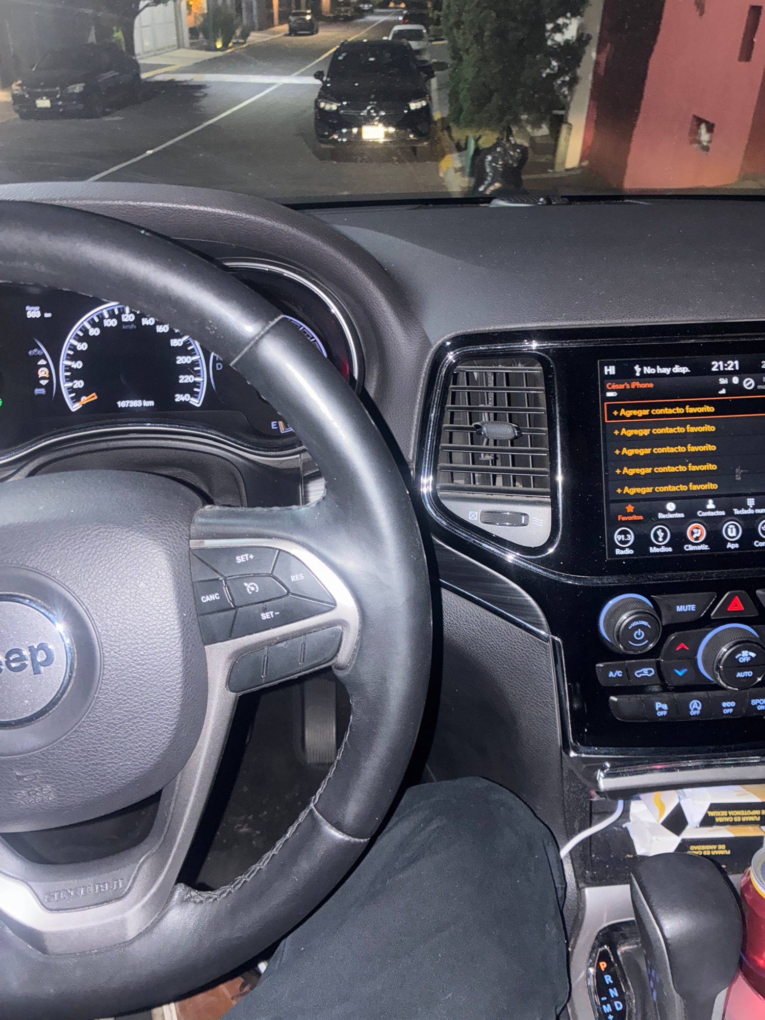 The image shows the interior of a Jeep, specifically the steering wheel, dashboard, and center console. The dashboard screen displays an interface in Spanish, prompting the user to "Agregar contacto f…read more