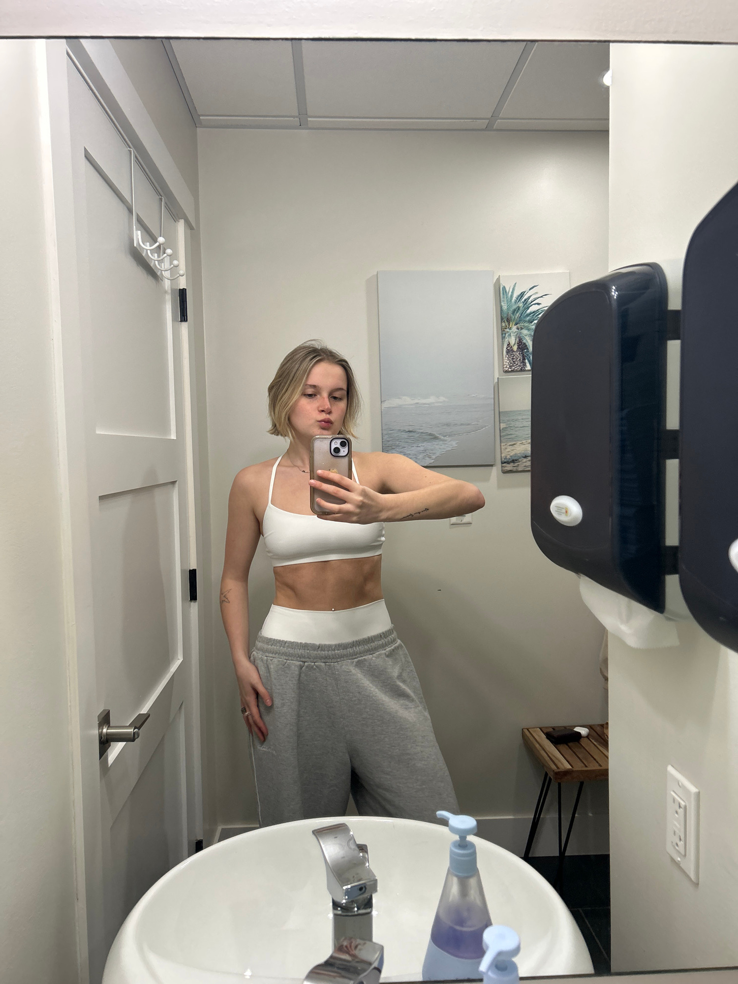 A young woman is taking a selfie in a bathroom mirror. She is wearing a white sports bra and grey sweatpants. Her blonde hair is short and wavy. The bathroom features a white sink, a stainless steel f…read more