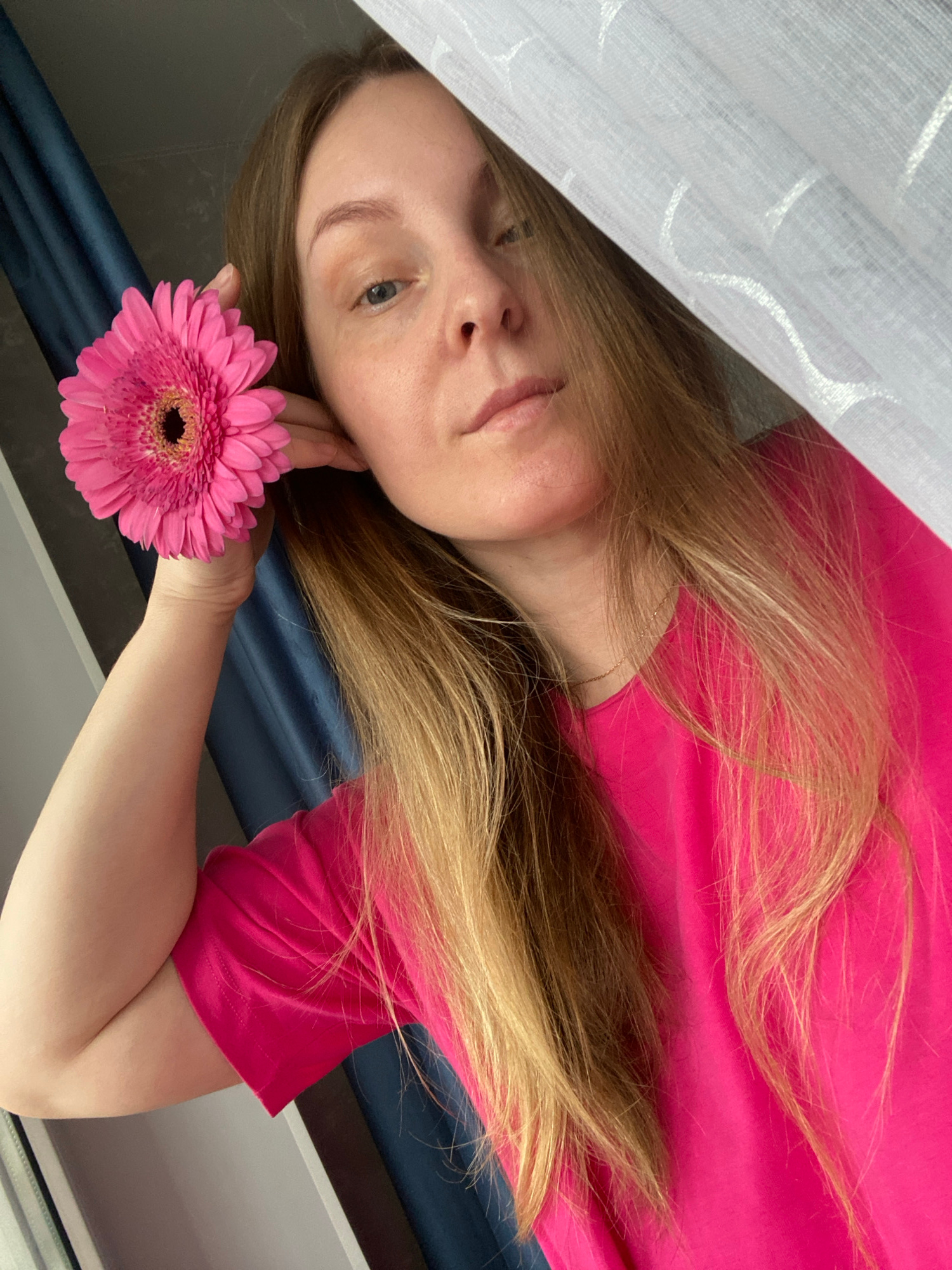 A woman with light skin, light brown hair, and blue eyes is holding a pink gerbera daisy near her face. She is wearing a bright pink t-shirt. Her hair is long and partially covers her face. The backgr…read more