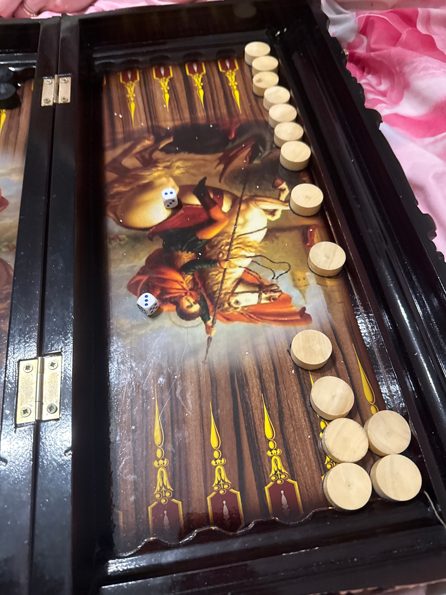 An open backgammon board is depicted from an overhead angle, set for play. The board itself is dark, possibly black or dark brown, with a glossy finish. Its playing surface features a printed image of…read more