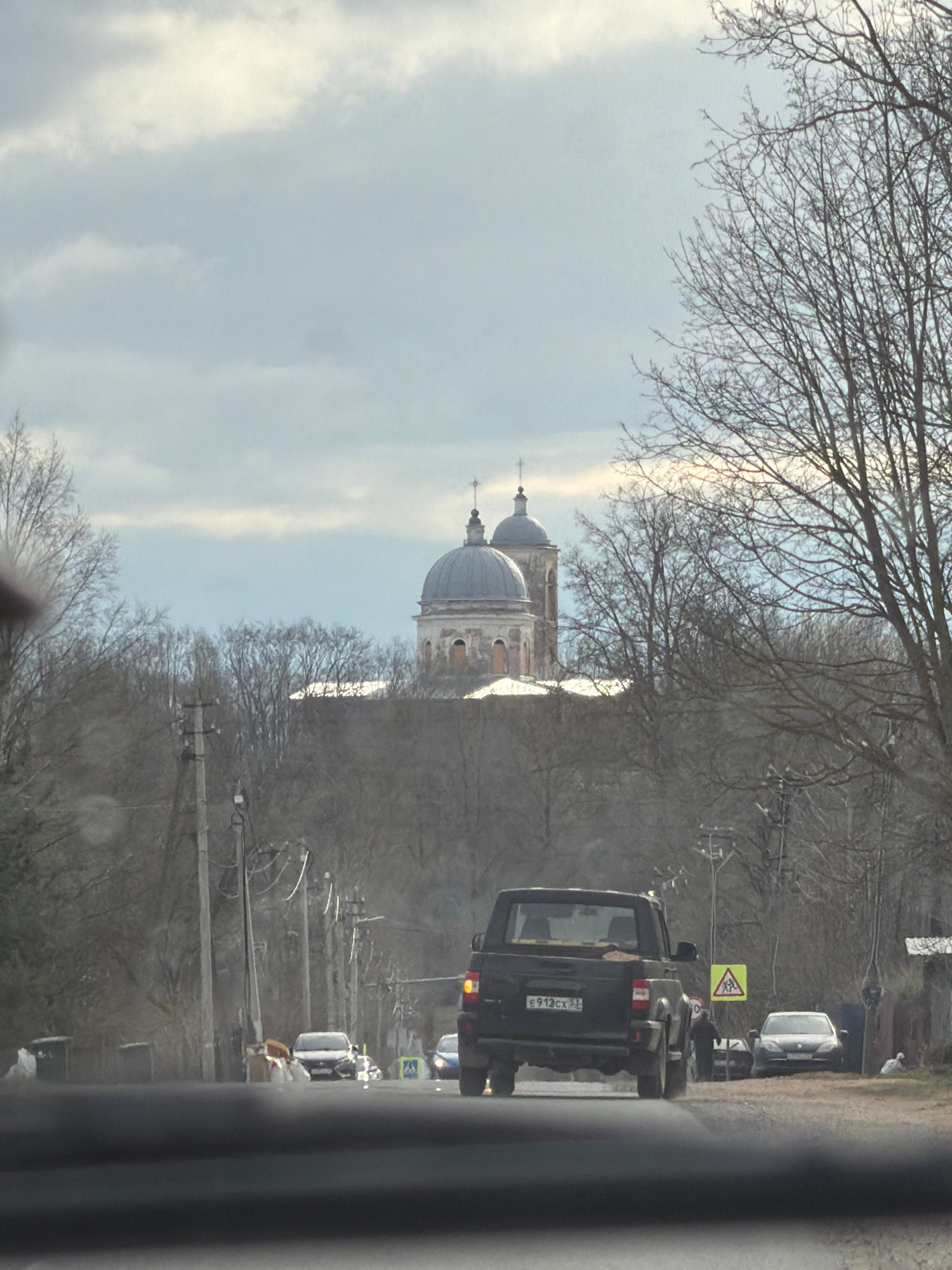The image, taken in Бронницы, Russia, shows a partial view from inside a vehicle, likely a car. A road is visible, with several vehicles traveling on it. A black SUV with license plate "E972CX 50" is…read more