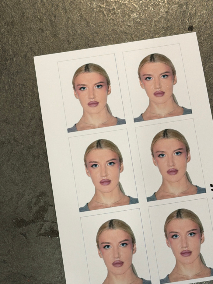 The scene in Khimki, Russia, displays a sheet of six passport-style photographs arranged in a 2x3 grid, viewed from an oblique angle. The white paper sheet is resting on a dark, textured surface, poss…read more