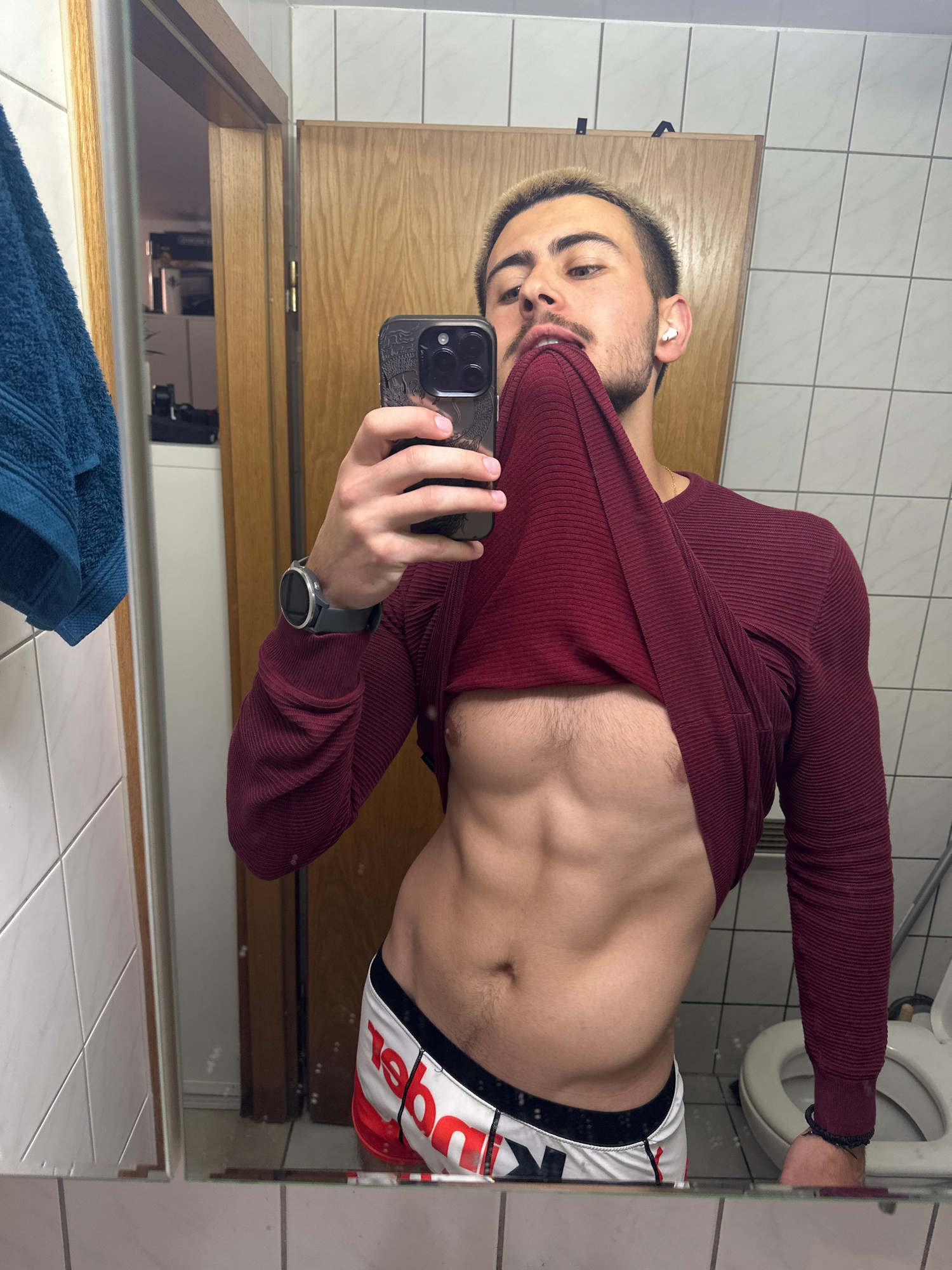 An image, rotated 90 degrees counter-clockwise, captures a young man taking a mirror selfie in what appears to be a bathroom. The man has short, dark hair with bleached highlights on top and a dark be…read more