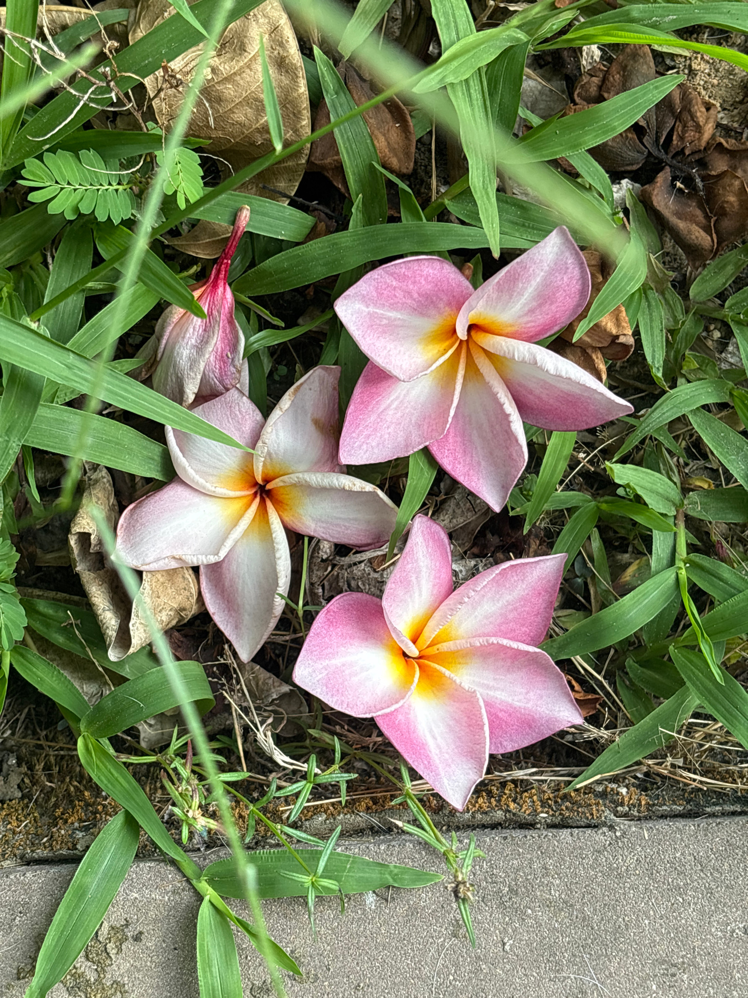 The image depicts three fallen plumeria flowers with pink and yellow petals resting amongst green grass and dried leaves. The flowers are scattered on the ground near a concrete edge. The location is…read more