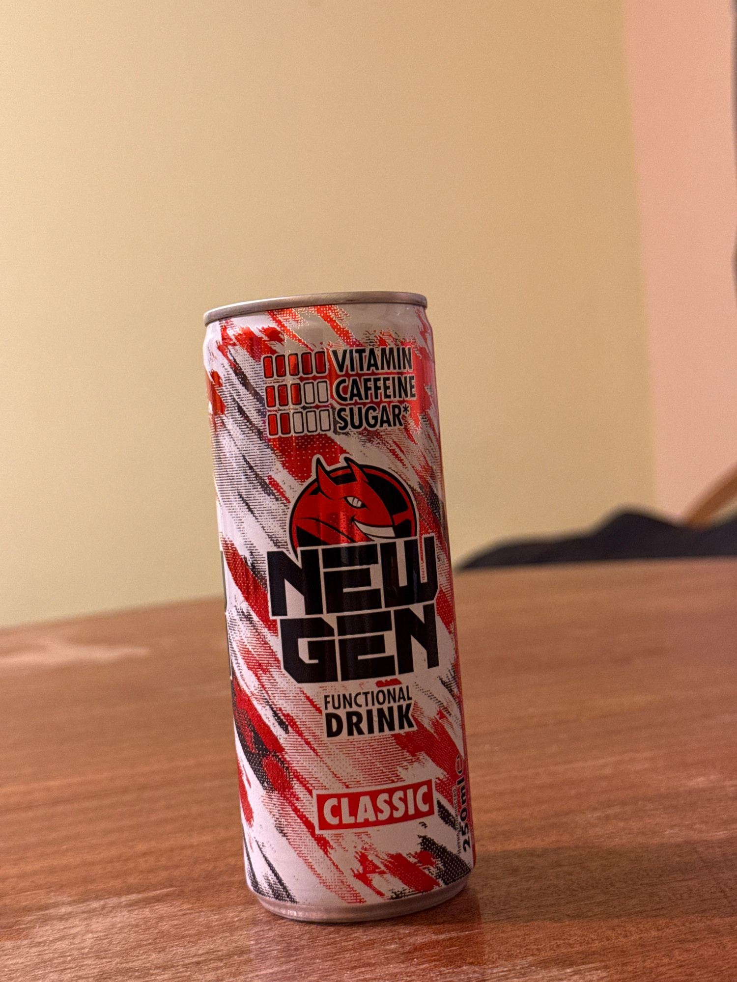 A slightly overexposed, medium-shot photograph shows a can of New Gen Classic functional drink on a wood surface, likely a table. The can features a white background with red and black streaks, alongs…read more
