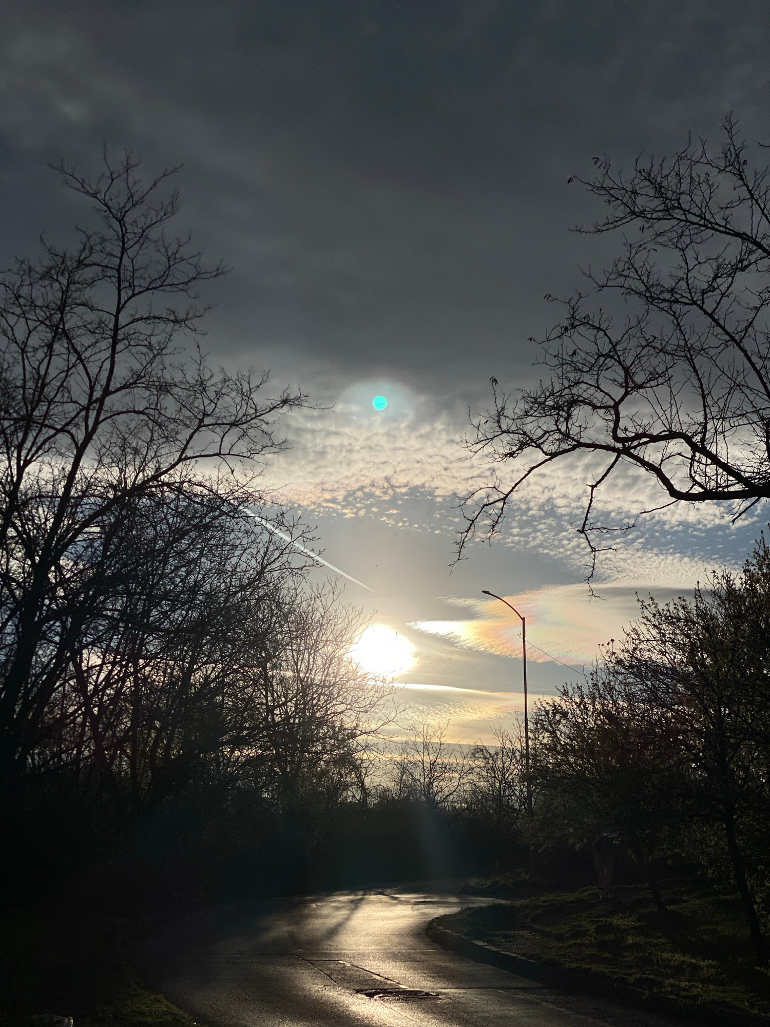 The image captures a street scene in Pleven, Bulgaria, under a sky featuring a bright sun and a cloud formation exhibiting iridescent colors. A tall, thin street lamp stands near the center of the fra…read more