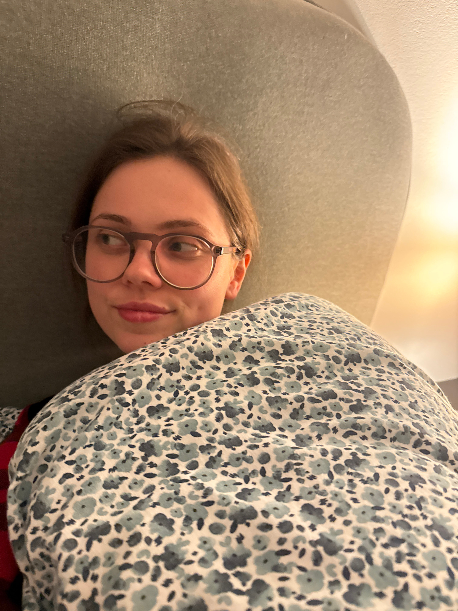 A young woman lies on a gray upholstered surface, likely a couch or bed, partially covered by a light-colored floral patterned blanket. She wears round-framed glasses and gazes towards the camera with…read more