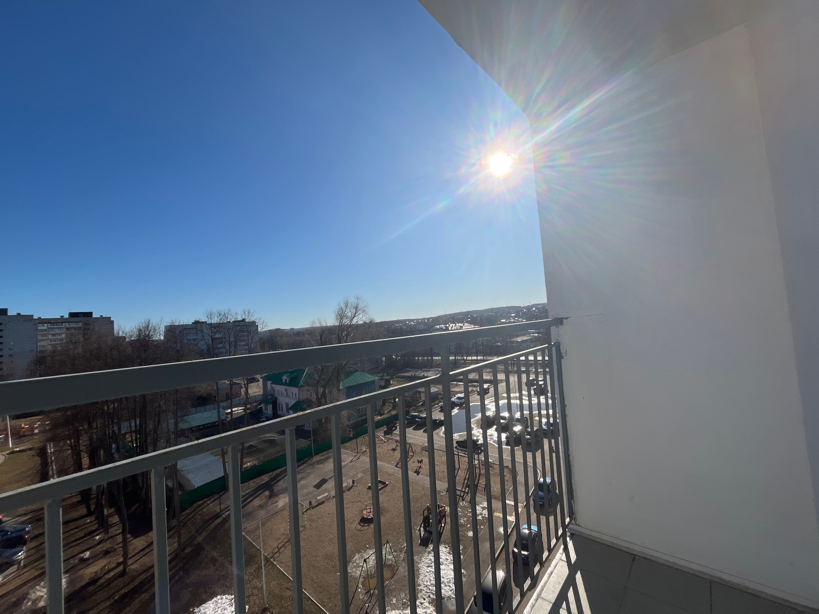 The image is a high-angle view from a balcony, likely in an apartment building, located in Chaikovsky, Russia. The sky is a clear blue, and the sun is high and bright, causing lens flare in the image.β¦read more