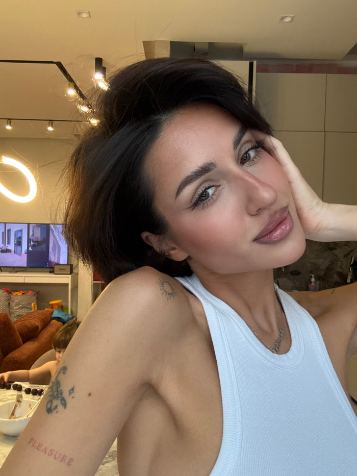 The image depicts a female subject, foregrounded, in an indoor residential setting in Unknown, Unknown. The woman has dark hair styled loosely and wears a light-colored ribbed tank top. Her left hand…read more