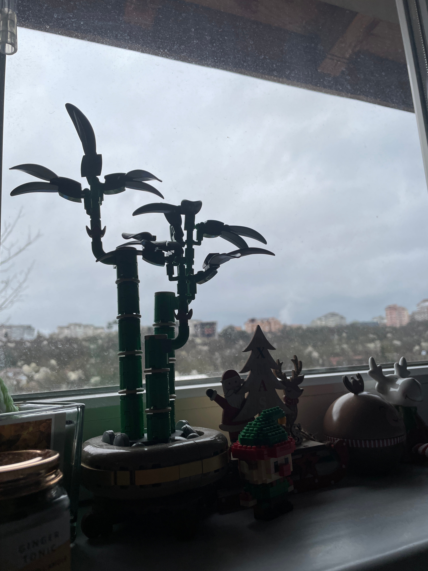 The scene is indoors, near a window, and includes a Lego tree model, other Christmas decorations, and part of a window view of the city. Specifically, in the foreground and against the window light i…read more